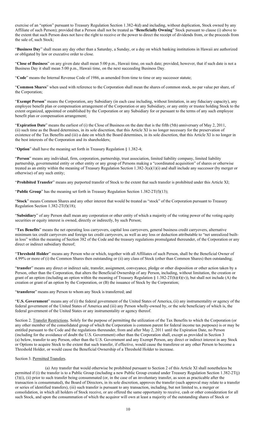 exercise of an “option” pursuant to Treasury Regulation Section 1.382-4(d) and including, without duplication, Stock owned by any Affiliate of such Person); provided that a Person shall not be treated as “Beneficially Owning” Stock pursuant to clause (i) above to the extent that such Person does not have the right to receive or the power to direct the receipt of dividends from, or the proceeds from the sale of, such Stock; “Business Day” shall mean any day other than a Saturday, a Sunday, or a day on which banking institutions in Hawaii are authorized or obligated by law or executive order to close. “Close of Business” on any given date shall mean 5:00 p.m., Hawaii time, on such date; provided, however, that if such date is not a Business Day it shall mean 5:00 p.m., Hawaii time, on the next succeeding Business Day. “Code” means the Internal Revenue Code of 1986, as amended from time to time or any successor statute; “Common Shares” when used with reference to the Corporation shall mean the shares of common stock, no par value per share, of the Corporation; “Exempt Person” means the Corporation, any Subsidiary (in each case including, without limitation, in any fiduciary capacity), any employee benefit plan or compensation arrangement of the Corporation or any Subsidiary, or any entity or trustee holding Stock to the extent organized, appointed or established by the Corporation or any Subsidiary for or pursuant to the terms of any such employee benefit plan or compensation arrangement; “Expiration Date” means the earliest of (i) the Close of Business on the date that is the fifth (5th) anniversary of May 2, 2011, (ii) such time as the Board determines, in its sole discretion, that this Article XI is no longer necessary for the preservation of existence of the Tax Benefits and (iii) a date on which the Board determines, in its sole discretion, that this Article XI is no longer in the best interests of the Corporation and its shareholders; “Option” shall have the meaning set forth in Treasury Regulation § 1.382-4; “Person” means any individual, firm, corporation, partnership, trust association, limited liability company, limited liability partnership, governmental entity or other entity or any group of Persons making a “coordinated acquisition” of shares or otherwise treated as an entity within the meaning of Treasury Regulation Section 1.382-3(a)(1)(i) and shall include any successor (by merger or otherwise) of any such entity; “Prohibited Transfer” means any purported transfer of Stock to the extent that such transfer is prohibited under this Article XI; “Public Group” has the meaning set forth in Treasury Regulation Section 1.382-2T(f)(13); “Stock” means Common Shares and any other interest that would be treated as “stock” of the Corporation pursuant to Treasury Regulation Section 1.382-2T(f)(18); “Subsidiary” of any Person shall mean any corporation or other entity of which a majority of the voting power of the voting equity securities or equity interest is owned, directly or indirectly, by such Person; “Tax Benefits” means the net operating loss carryovers, capital loss carryovers, general business credit carryovers, alternative minimum tax credit carryovers and foreign tax credit carryovers, as well as any loss or deduction attributable to “net unrealized built- in loss” within the meaning of Section 382 of the Code and the treasury regulations promulgated thereunder, of the Corporation or any direct or indirect subsidiary thereof; “Threshold Holder” means any Person who or which, together with all Affiliates of such Person, shall be the Beneficial Owner of 4.99% or more of (i) the Common Shares then outstanding or (ii) any class of Stock (other than Common Shares) then outstanding; “transfer” means any direct or indirect sale, transfer, assignment, conveyance, pledge or other disposition or other action taken by a Person, other than the Corporation, that alters the Beneficial Ownership of any Person, including, without limitation, the creation or grant of an option (including an option within the meaning of Treasury Regulation § 1.382-2T(h)(4)(v)), but shall not include (A) the creation or grant of an option by the Corporation, or (B) the issuance of Stock by the Corporation; “transferee” means any Person to whom any Stock is transferred; and “U.S. Government” means any of (i) the federal government of the United States of America, (ii) any instrumentality or agency of the federal government of the United States of America and (iii) any Person wholly-owned by, or the sole beneficiary of which is, the federal government of the United States or any instrumentality or agency thereof. Section 2. Transfer Restrictions. Solely for the purpose of permitting the utilization of the Tax Benefits to which the Corporation (or any other member of the consolidated group of which the Corporation is common parent for federal income tax purposes) is or may be entitled pursuant to the Code and the regulations thereunder, from and after May 2, 2011 until the Expiration Date, no Person (including for the avoidance of doubt the U.S. Government) other than the Corporation shall, except as provided in Section 3 (a) below, transfer to any Person, other than the U.S. Government and any Exempt Person, any direct or indirect interest in any Stock or Options to acquire Stock to the extent that such transfer, if effective, would cause the transferee or any other Person to become a Threshold Holder, or would cause the Beneficial Ownership of a Threshold Holder to increase. Section 3. Permitted Transfers. (a) Any transfer that would otherwise be prohibited pursuant to Section 2 of this Article XI shall nonetheless be permitted if (i) the transfer is to a Public Group (including a new Public Group created under Treasury Regulation Section 1.382-2T(j) (3)(i), (ii) prior to such transfer being consummated (or, in the case of an