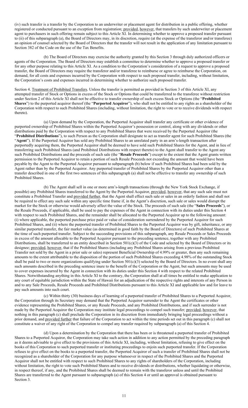 (iv) such transfer is a transfer by the Corporation to an underwriter or placement agent for distribution in a public offering, whether registered or conducted pursuant to an exception from registration; provided, however, that transfers by such underwriter or placement agent to purchasers in such offering remain subject to this Article XI. In determining whether to approve a proposed transfer pursuant to (ii) of this subparagraph (a), the Board of Directors may, in its discretion, require (at the expense of the transferor and/or transferee) an opinion of counsel selected by the Board of Directors that the transfer will not result in the application of any limitation pursuant to Section 382 of the Code on the use of the Tax Benefits. (b) The Board of Directors may exercise the authority granted by this Section 3 through duly authorized officers or agents of the Corporation. The Board of Directors may establish a committee to determine whether to approve a proposed transfer or for any other purpose relating to this Article XI. As a condition to the Corporation’s consideration of a request to approve a proposed transfer, the Board of Directors may require the transferor and/or transferee to reimburse or agree to reimburse the Corporation, on demand, for all costs and expenses incurred by the Corporation with respect to such proposed transfer, including, without limitation, the Corporation’s costs and expenses incurred in determining whether to authorize such proposed transfer. Section 4. Treatment of Prohibited Transfers. Unless the transfer is permitted as provided in Section 3 of this Article XI, any attempted transfer of Stock or Options in excess of the Stock or Options that could be transferred to the transferee without restriction under Section 2 of this Article XI shall not be effective to transfer ownership of such excess Stock or Options (the “Prohibited Shares”) to the purported acquiror thereof (the “Purported Acquiror”), who shall not be entitled to any rights as a shareholder of the Corporation with respect to such Prohibited Shares (including, without limitation, the right to vote or to receive dividends with respect thereto). (a) Upon demand by the Corporation, the Purported Acquiror shall transfer any certificate or other evidence of purported ownership of Prohibited Shares within the Purported Acquiror’s possession or control, along with any dividends or other distributions paid by the Corporation with respect to any Prohibited Shares that were received by the Purported Acquiror (the “Prohibited Distributions”), to such Person as the Corporation shall designate to act as transfer agent for such Prohibited Shares (the “Agent”). If the Purported Acquiror has sold any Prohibited Shares to an unrelated party in an arm’s-length transaction after purportedly acquiring them, the Purported Acquiror shall be deemed to have sold such Prohibited Shares for the Agent, and in lieu of transferring such Prohibited Shares (and Prohibited Distributions with respect thereto) to the Agent shall transfer to the Agent any such Prohibited Distributions and the proceeds of such sale (the “Resale Proceeds”) except to the extent that the Agent grants written permission to the Purported Acquiror to retain a portion of such Resale Proceeds not exceeding the amount that would have been payable by the Agent to the Purported Acquiror pursuant to subparagraph (b) below if such Prohibited Shares had been sold by the Agent rather than by the Purported Acquiror. Any purported transfer of Prohibited Shares by the Purported Acquiror other than a transfer described in one of the first two sentences of this subparagraph (a) shall not be effective to transfer any ownership of such Prohibited Shares. (b) The Agent shall sell in one or more arm’s-length transactions (through the New York Stock Exchange, if possible) any Prohibited Shares transferred to the Agent by the Purported Acquiror, provided, however, that any such sale must not constitute a Prohibited Transfer and provided further, that the Agent shall effect such sale or sales in an orderly fashion and shall not be required to effect any such sale within any specific time frame if, in the Agent’s discretion, such sale or sales would disrupt the market for the Stock or otherwise would adversely affect the value of the Stock. The proceeds of such sale (the “Sales Proceeds”), or the Resale Proceeds, if applicable, shall be used to pay the expenses of the Agent in connection with its duties under this Section 4 with respect to such Prohibited Shares, and the remainder shall be allocated to the Purported Acquiror up to the following amount: (i) where applicable, the purported purchase price paid or value of consideration surrendered by the Purported Acquiror for such Prohibited Shares, and (ii) where the purported transfer of Prohibited Shares to the Purported Acquiror was by gift, inheritance, or any similar purported transfer, the fair market value (as determined in good faith by the Board of Directors) of such Prohibited Shares at the time of such purported transfer. Subject to the succeeding provisions of this subparagraph, any Resale Proceeds or Sales Proceeds in excess of the amount allocable to the Purported Acquiror pursuant to the preceding sentence, together with any Prohibited Distributions, shall be transferred to an entity described in Section 501(c)(3) of the Code and selected by the Board of Directors or its designee; provided, however, that if the Prohibited Shares (including any Prohibited Shares arising from a previous Prohibited Transfer not sold by the Agent in a prior sale or sales) represent Beneficial Ownership of 4.99% or greater, then any such remaining amounts to the extent attributable to the disposition of the portion of such Prohibited Shares exceeding 4.98% of the outstanding Stock shall be paid to two or more organizations qualifying under Section 501(c)(3) selected by the Board of Directors. I