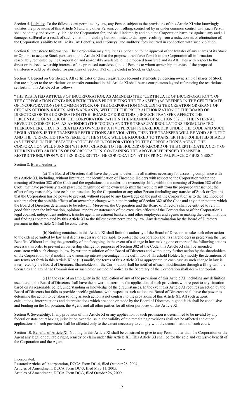 Section 5. Liability. To the fullest extent permitted by law, any Person subject to the provisions of this Article XI who knowingly violates the provisions of this Article XI and any other Persons controlling, controlled by or under common control with such Person shall be jointly and severally liable to the Corporation for, and shall indemnify and hold the Corporation harmless against, any and all damages suffered as a result of such violation, including but not limited to damages resulting from a reduction in, or elimination of, the Corporation’s ability to utilize its Tax Benefits, and attorneys’ and auditors’ fees incurred in connection with such violation. Section 6. Transferee Information. The Corporation may require as a condition to the approval of the transfer of any shares of its Stock or Options to acquire Stock pursuant to this Article XI that the proposed transferee furnish to the Corporation all information reasonably requested by the Corporation and reasonably available to the proposed transferee and its Affiliates with respect to the direct or indirect ownership interests of the proposed transferee (and of Persons to whom ownership interests of the proposed transferee would be attributed for purposes of Section 382 of the Code) in Stock or Options. Section 7. Legend on Certificates. All certificates or direct registration account statements evidencing ownership of shares of Stock that are subject to the restrictions on transfer contained in this Article XI shall bear a conspicuous legend referencing the restrictions set forth in this Article XI as follows: “THE RESTATED ARTICLES OF INCORPORATION, AS AMENDED (THE “CERTIFICATE OF INCORPORATION”), OF THE CORPORATION CONTAINS RESTRICTIONS PROHIBITING THE TRANSFER (AS DEFINED IN THE CERTIFICATE OF INCORPORATION) OF COMMON STOCK OF THE CORPORATION (INCLUDING THE CREATION OR GRANT OF CERTAIN OPTIONS, RIGHTS AND WARRANTS) WITHOUT THE PRIOR AUTHORIZATION OF THE BOARD OF DIRECTORS OF THE CORPORATION (THE “BOARD OF DIRECTORS”) IF SUCH TRANSFER AFFECTS THE PERCENTAGE OF STOCK OF THE CORPORATION (WITHIN THE MEANING OF SECTION 382 OF THE INTERNAL REVENUE CODE OF 1986, AS AMENDED (THE “CODE”) AND THE TREASURY REGULATIONS PROMULGATED THEREUNDER), THAT IS TREATED AS OWNED BY A FIVE PERCENT SHAREHOLDER UNDER THE CODE AND SUCH REGULATIONS. IF THE TRANSFER RESTRICTIONS ARE VIOLATED, THEN THE TRANSFER WILL BE VOID AB INITIO AND THE PURPORTED TRANSFEREE OF THE STOCK WILL BE REQUIRED TO TRANSFER THE PROHIBITED SHARES (AS DEFINED IN THE RESTATED ARTICLES OF INCORPORATION) TO THE CORPORATION’S AGENT. THE CORPORATION WILL FURNISH WITHOUT CHARGE TO THE HOLDER OF RECORD OF THIS CERTIFICATE A COPY OF THE RESTATED ARTICLES OF INCORPORATION, CONTAINING THE ABOVE-REFERENCED TRANSFER RESTRICTIONS, UPON WRITTEN REQUEST TO THE CORPORATION AT ITS PRINCIPAL PLACE OF BUSINESS.” Section 8. Board Authority. (a) The Board of Directors shall have the power to determine all matters necessary for assessing compliance with this Article XI, including, without limitation, the identification of Threshold Holders with respect to the Corporation within the meaning of Section 382 of the Code and the regulations thereunder; the ownership shifts, within the meaning of Section 382 of the Code, that have previously taken place; the magnitude of the ownership shift that would result from the proposed transaction; the effect of any reasonably foreseeable transactions by the Corporation or any other Person (including any transfer of Stock or Options that the Corporation has no power to prevent, without regard to any knowledge on the part of the Corporation as to the likelihood of such transfer); the possible effects of an ownership change within the meaning of Section 382 of the Code and any other matters which the Board of Directors determines to be relevant. Moreover, the Corporation and the Board of Directors shall be entitled to rely in good faith upon the information, opinions, reports or statements of the executive officers of the Corporation or of the Corporation’s legal counsel, independent auditors, transfer agent, investment bankers, and other employees and agents in making the determinations and findings contemplated by this Article XI to the fullest extent permitted by law. Any determination by the Board of Directors pursuant to this Article XI shall be conclusive. (b) Nothing contained in this Article XI shall limit the authority of the Board of Directors to take such other action to the extent permitted by law as it deems necessary or advisable to protect the Corporation and its shareholders in preserving the Tax Benefits. Without limiting the generality of the foregoing, in the event of a change in law making one or more of the following actions necessary in order to prevent an ownership change for purposes of Section 382 of the Code, this Article XI shall be amended consistent with such change in law, by written resolution of the Board of Directors and without any further action by the shareholders of the Corporation, to (i) modify the ownership interest percentage in the definition of Threshold Holder, (ii) modify the definitions of any terms set forth in this Article XI or (iii) modify the terms of this Article XI as appropriate, in each case as such change in law is interpreted by the Board of Directors. Shareholders of the Corporation shall be notified of such modification through a filing with the Securities and Exchange Commission or such other method of notice as the Secretary of the Corporation shall deem appropriate. (c) In the case of an ambiguity in the application of any of the provisions of this Article XI, including any definition used herein, the Board of Directors shall have the power to determine the application of such provisions with respect to any situation based on its reasonable belief, understanding or knowledge of the circumstances. In the event this Article XI requires an action by the Board of Directors but fail