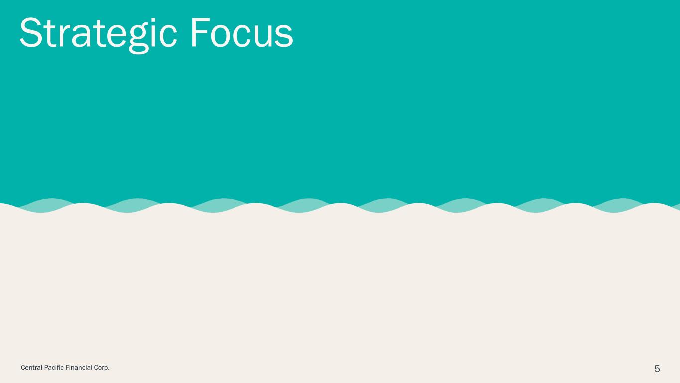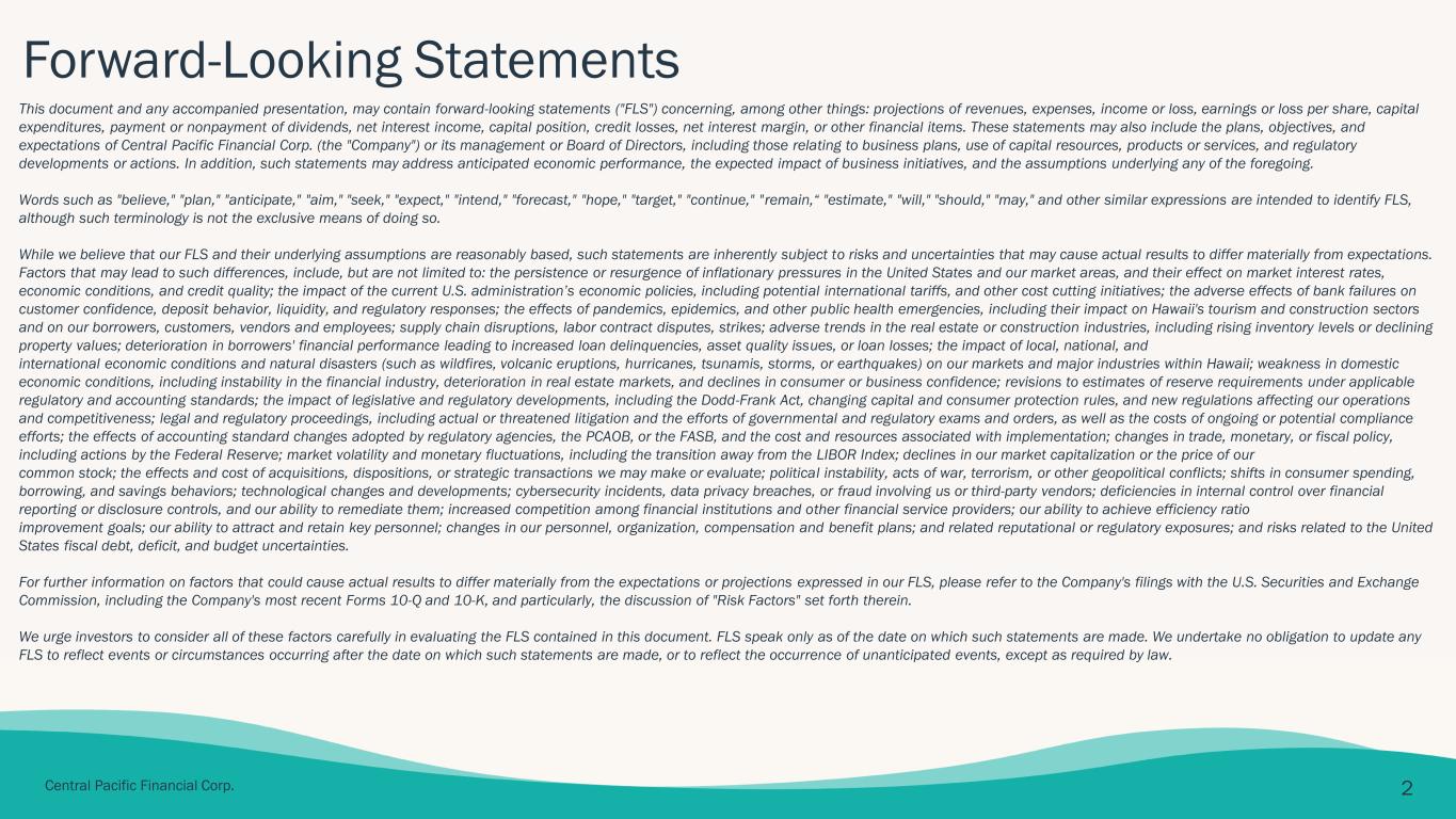 This document may contain forward-looking statements ("FLS") concerning, among other things: projections of revenues, expenses, income or loss, earnings or loss per share, capital expenditures, payment or nonpayment of dividends, net interest income, capital position, credit losses, net interest margin, or other financial items. These statement may also include the plans, objectives, and expectations of Central Pacific Financial Corp. (the "Company") or its management or Board of Directors, including those relating to business plans, use of capital resources, products or services, and regulatory developments or actions. In addition, such statements may address anticipated economic performance, the expected impact of business initiatives, and the assumptions underlying any of the foregoing.