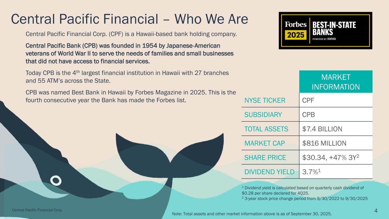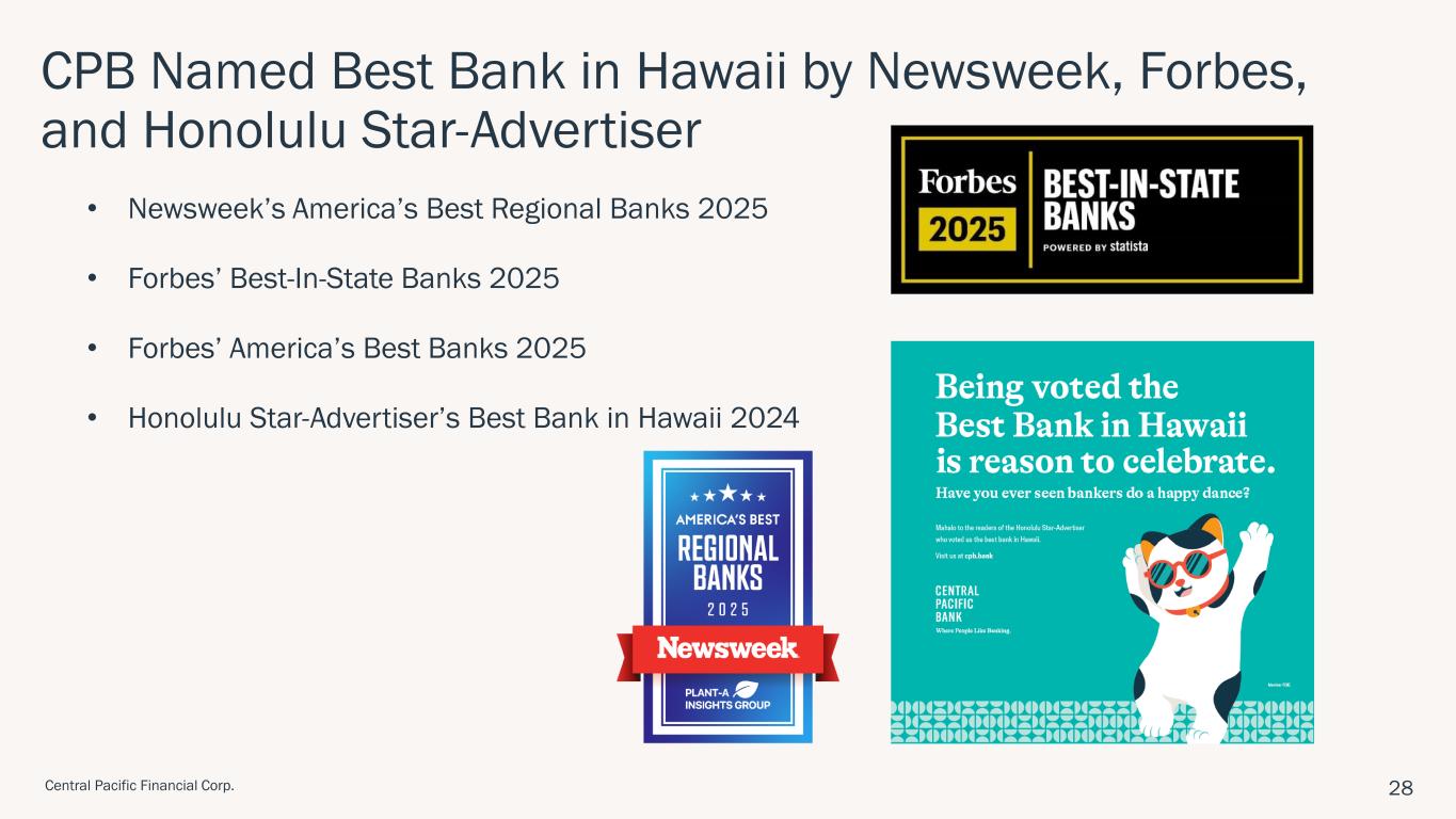 Central Pacific Financial Corp. is a Hawaii-based bank holding company with approximately $7.42 billion in assets as of September 30, 2025. Its primary subsidiary, Central Pacific Bank, operates 27 branches and 55 ATMs in the State of Hawaii. Central Pacific Financial Corp. is listed on the New York Stock Exchange under the symbol "CPF." For additional information, please visit: cpb.bank.
