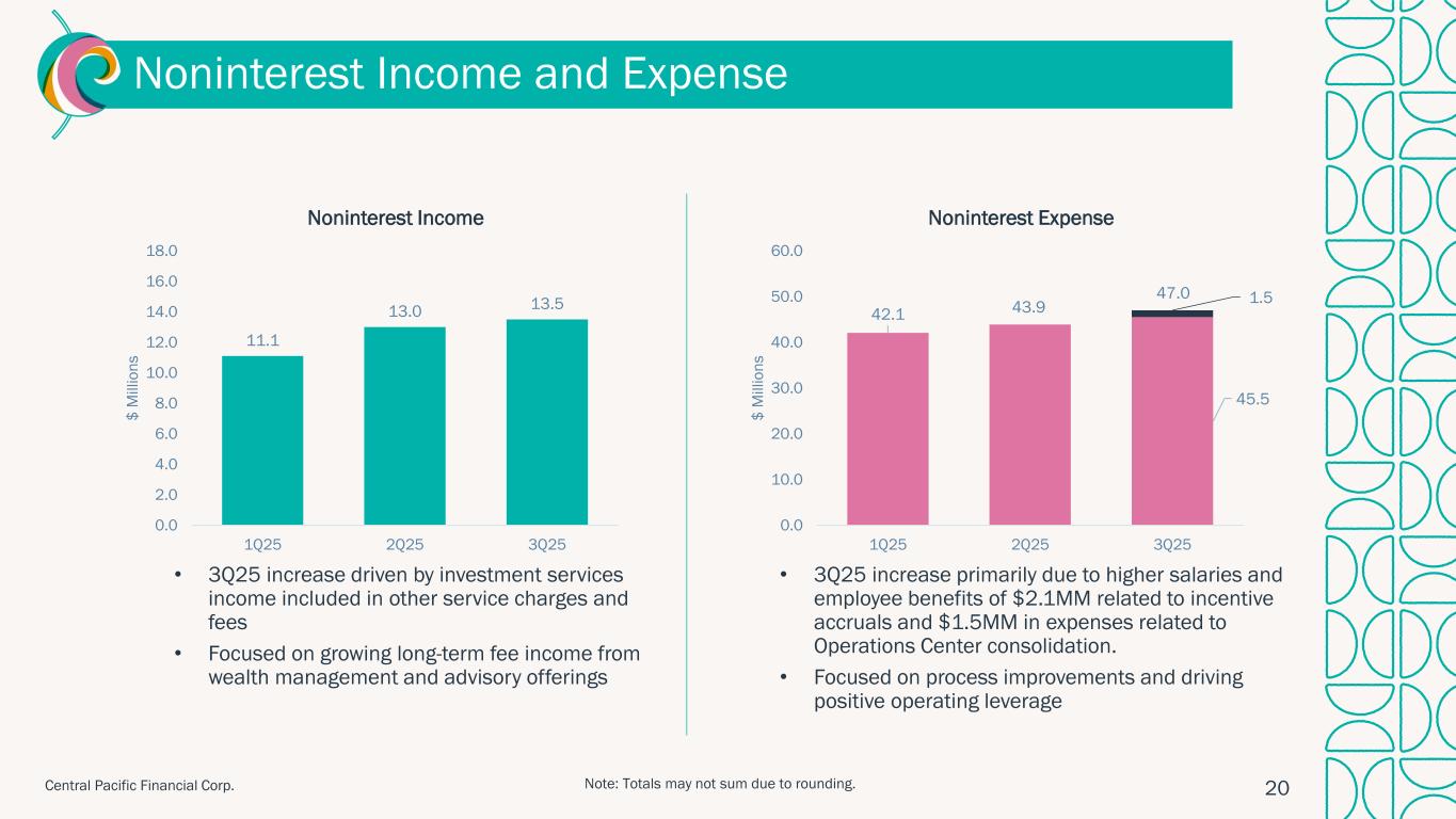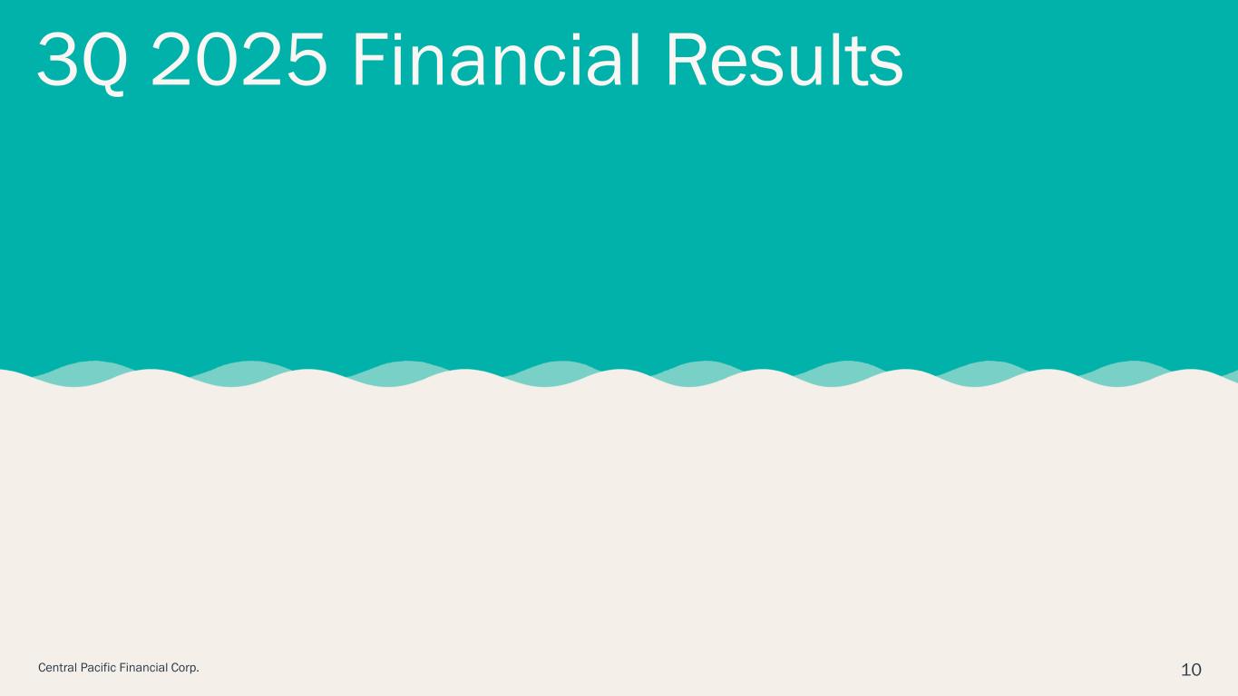 HONOLULU, HI, October 29, 2025 – Central Pacific Financial Corp. (NYSE: CPF) (the "Company"), parent company of Central Pacific Bank (the "Bank" or "CPB"), today reported net income of $18.6 million, or $0.69 per fully diluted earnings share ("EPS"), for the third quarter of 2025. This compares to net income of $18.3 million, or EPS of $0.67, in the prior quarter and $13.3 million, or EPS of $0.49, in the same quarter last year. Results for the third quarter of 2025 included $1.5 million in pre-tax expenses related to the consolidation of the Company's former operations center into its main office. Excluding this item, adjusted net income (non-GAAP) for the third quarter of 2025 was $19.7 million, or EPS (non-GAAP) of $0.73.