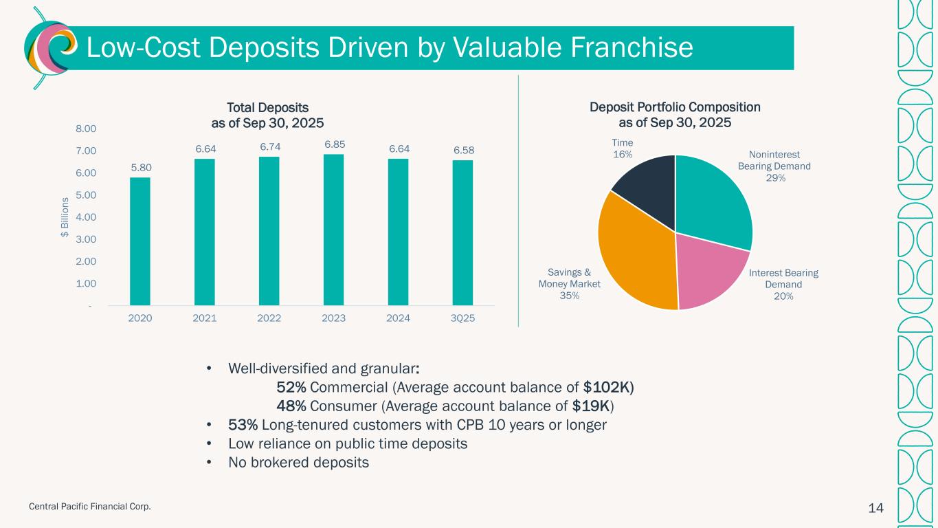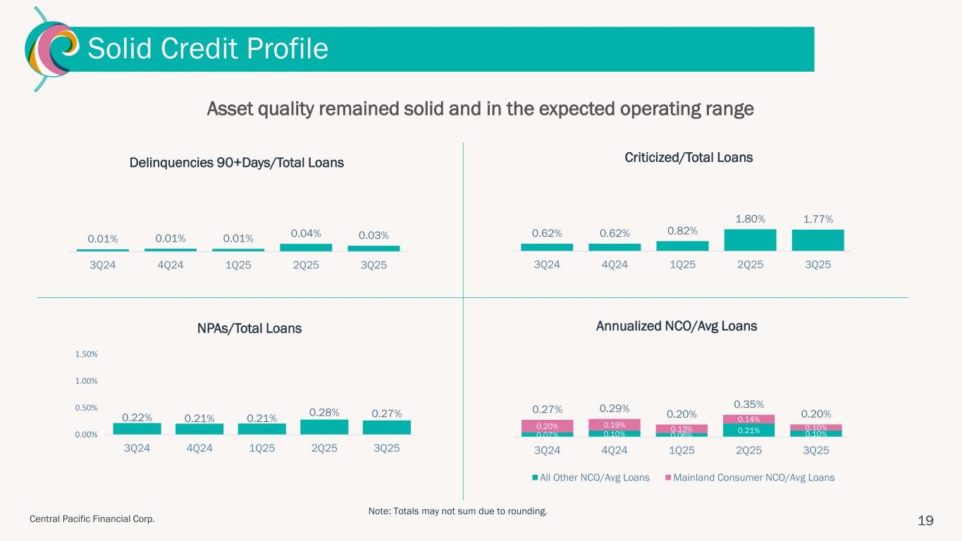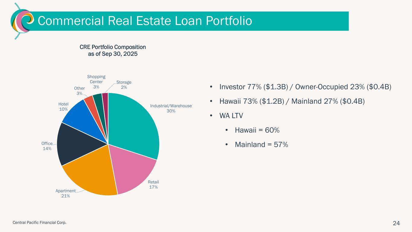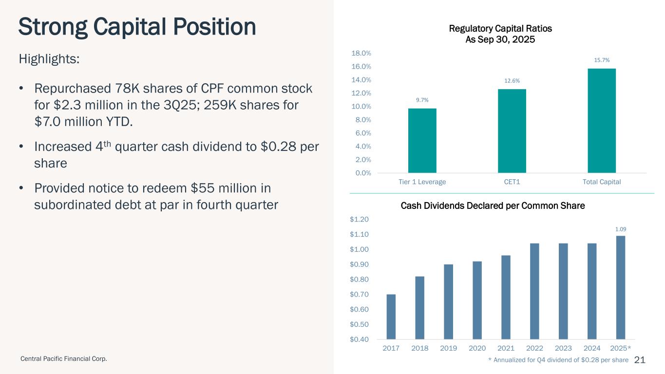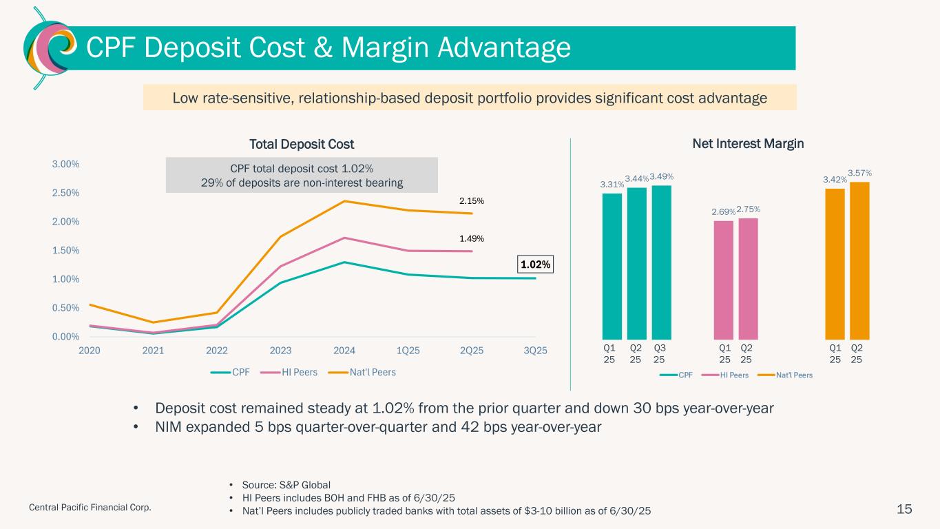 "Central Pacific delivered another strong quarter, highlighted by continued margin expansion, solid earnings, and growth in both loans and deposits," said Arnold Martines, Chairman, President and CEO. "Our net interest margin increased to 3.49%, reflecting disciplined balance sheet management and improved asset yields. With our strong earnings and capital position, in the fourth quarter we will redeem our subordinated debt and increase our quarterly cash dividend. Additionally, our new partnership with Kyoto Shinkin Bank marks an exciting step forward in deepening Hawaii–Japan business ties and expanding our international reach. These achievements reflect our continued positive momentum and commitment to providing exceptional service to our customers, and delivering long-term value to our shareholders."