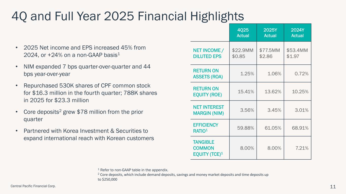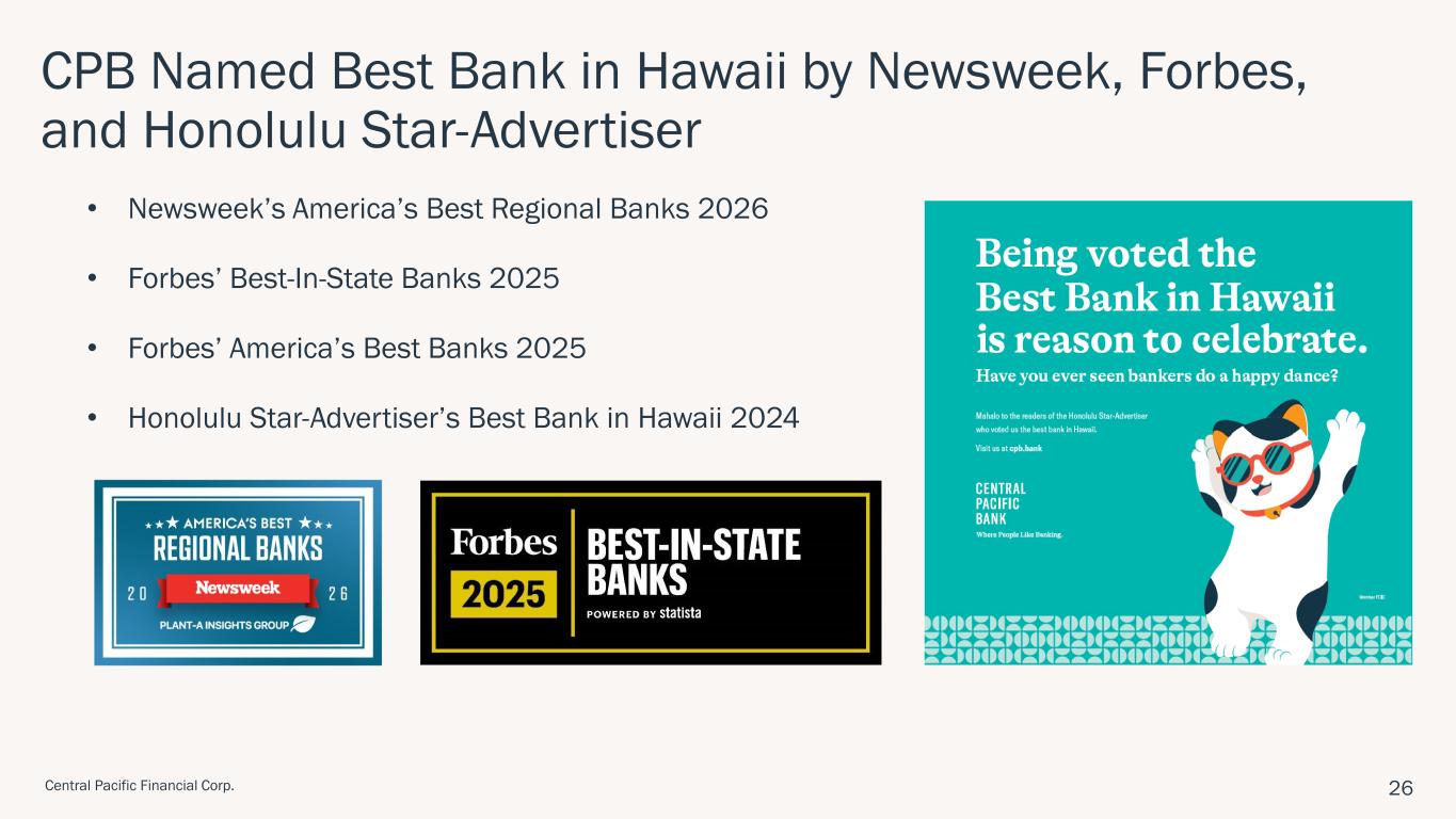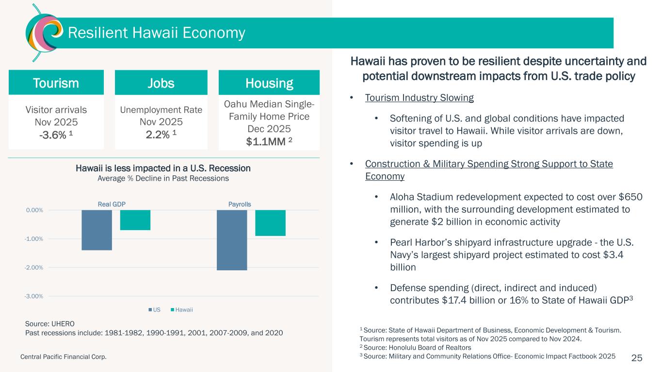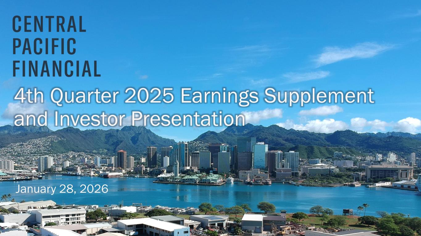 ハワイ州ホノルル、2026年1月28日 – セントラル・パシフィック・フィナンシャル・コーポレーション(NYSE: CPF)(以下「当社」)は、セントラル・パシフィック銀行(以下「当行」または「CPB」)の親会社として、2025年第4四半期の純利益が2,290万ドル(完全希薄化後1株当たり利益「EPS」0.85ドル)であったことを本日発表しました。 これは、前四半期の純利益1,860万ドル(1株当たり利益0.69ドル)、前年同期の純利益1,130万ドル(1株当たり利益0.42ドル)と比較したものである。 2025年通期では、純利益とEPSはそれぞれ7,750万ドル、2.86ドルとなり、2024年の純利益5,340万ドル、EPS1.97ドルから増加した。
