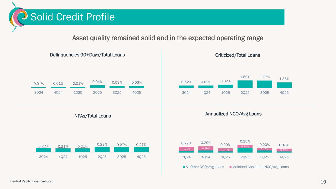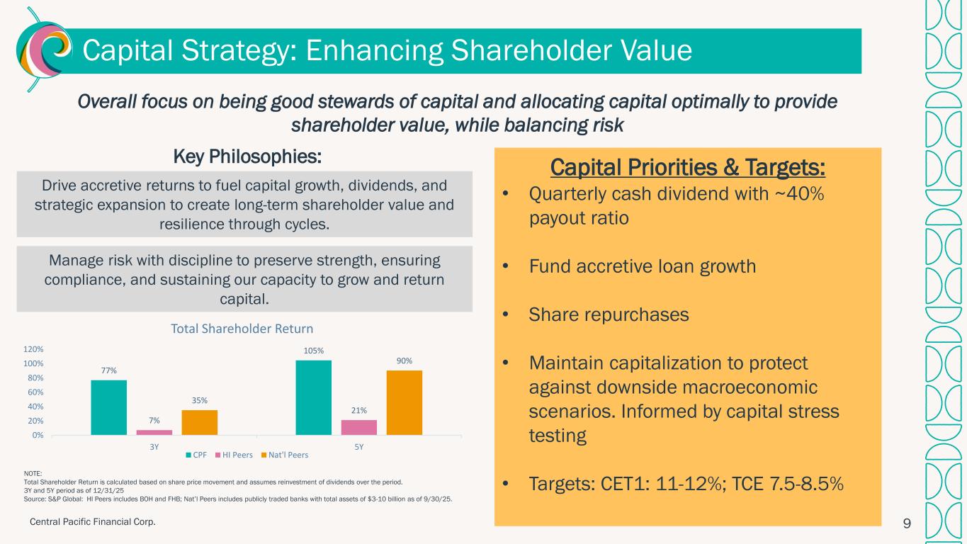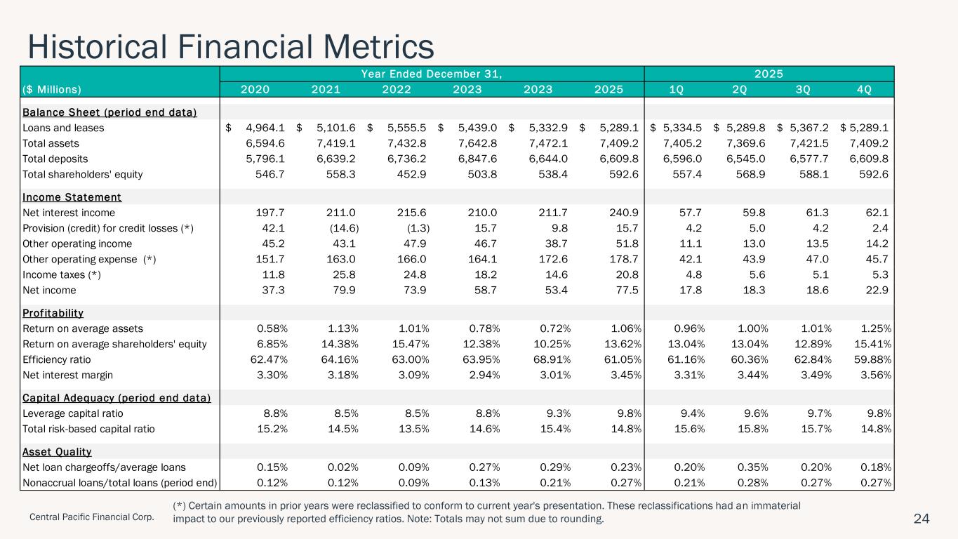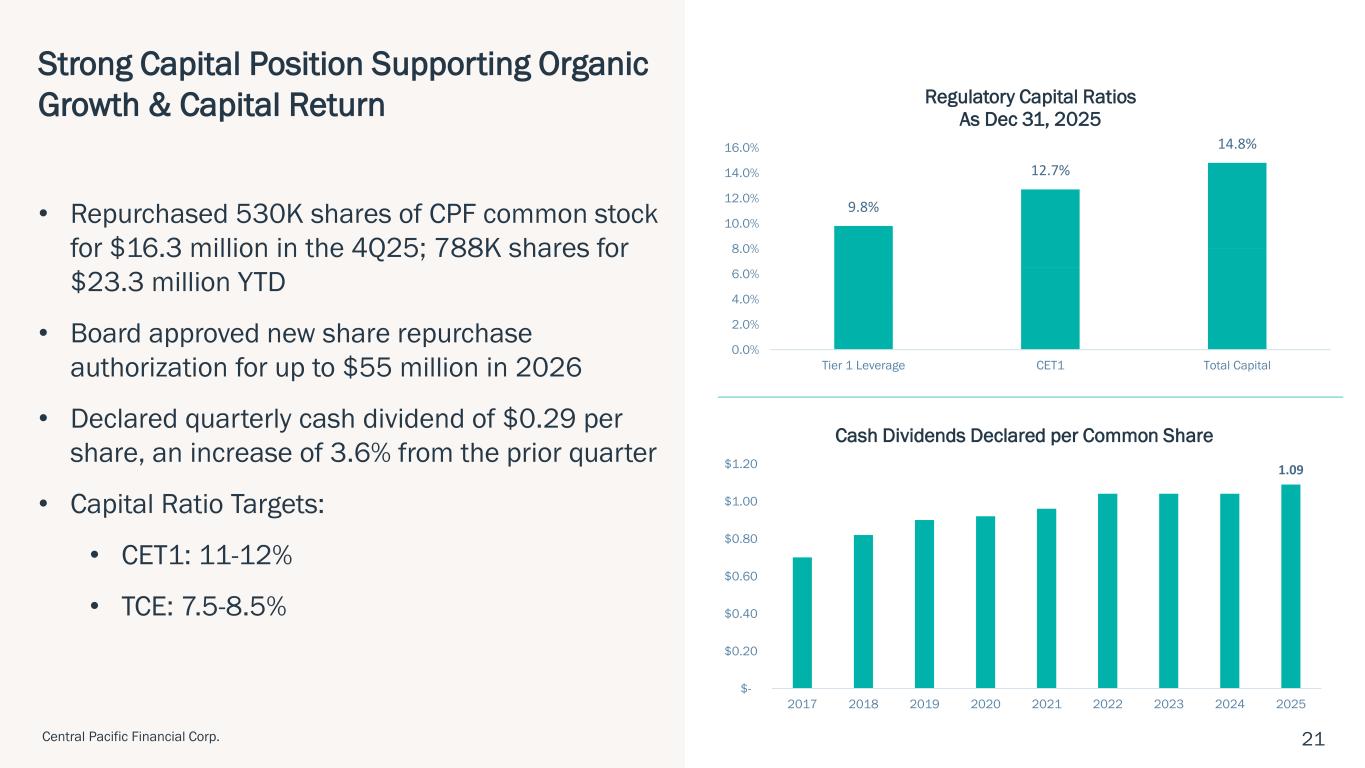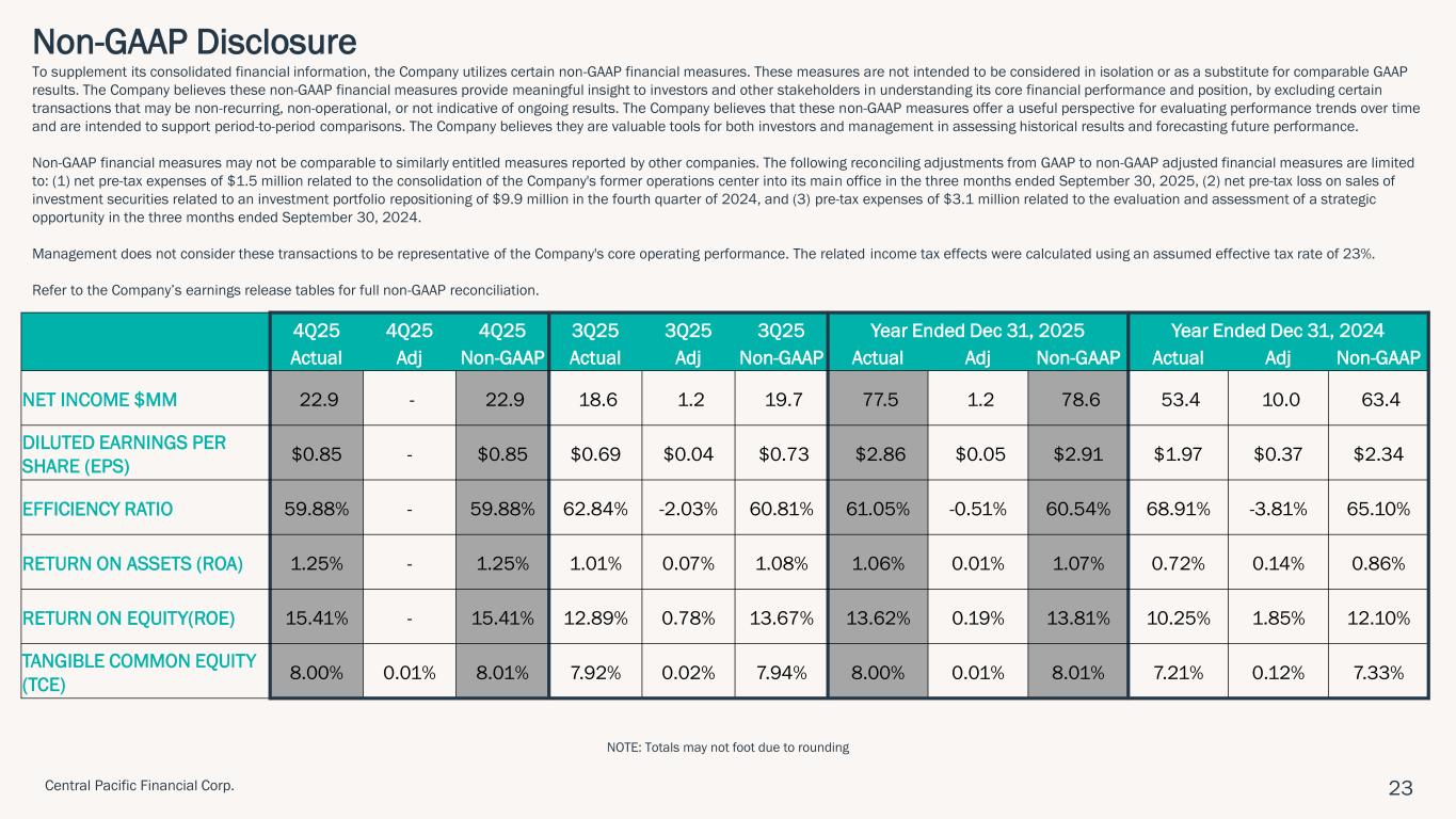 ハワイ州ホノルル、2026年1月28日 – セントラル・パシフィック・フィナンシャル・コーポレーション(NYSE: CPF)(以下「当社」)は、セントラル・パシフィック銀行(以下「当行」または「CPB」)の親会社として、2025年第4四半期の純利益が2,290万ドル(完全希薄化後1株当たり利益「EPS」0.85ドル)であったことを本日発表しました。 これは、前四半期の純利益1,860万ドル(1株当たり利益0.69ドル)、前年同期の純利益1,130万ドル(1株当たり利益0.42ドル)と比較したものである。 2025年通期では、純利益とEPSはそれぞれ7,750万ドル、2.86ドルとなり、2024年の純利益5,340万ドル、EPS1.97ドルから増加した。