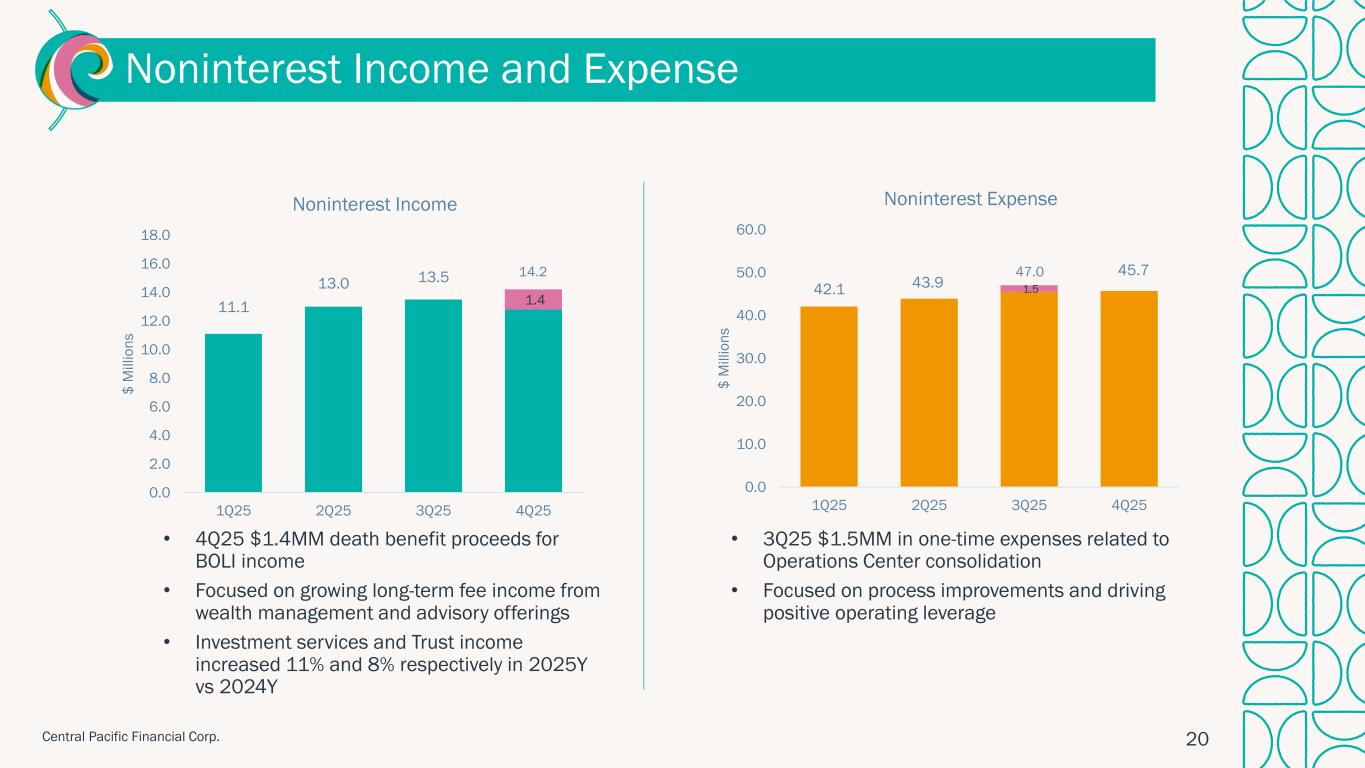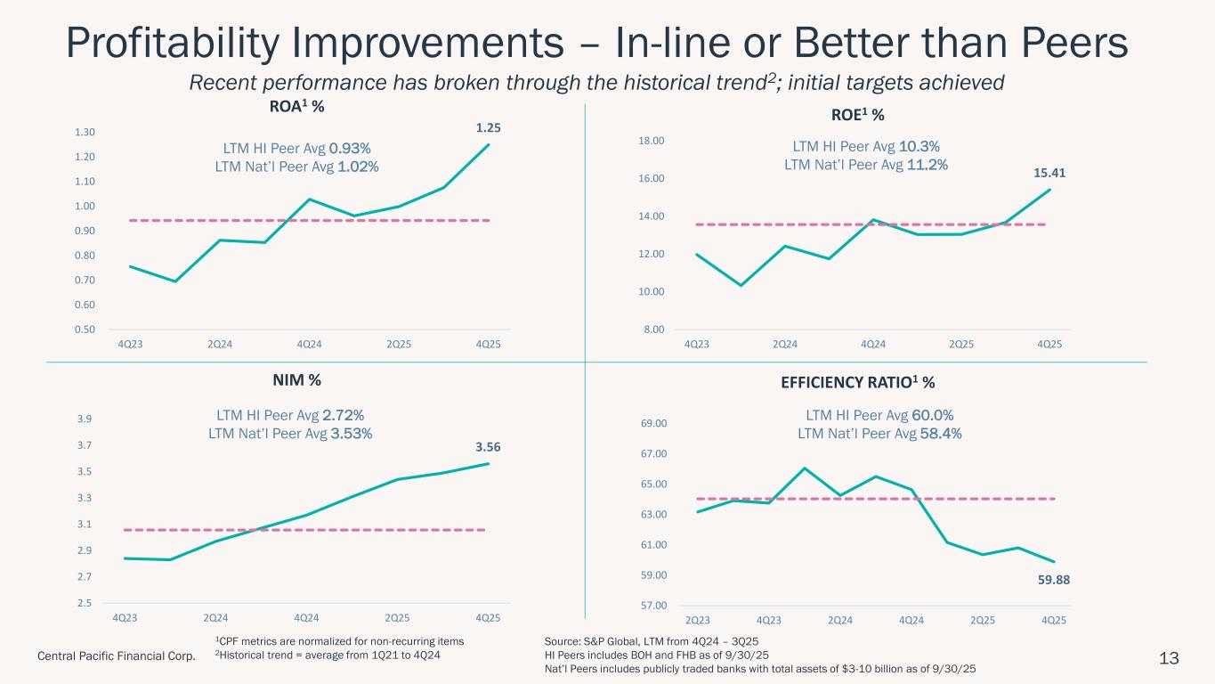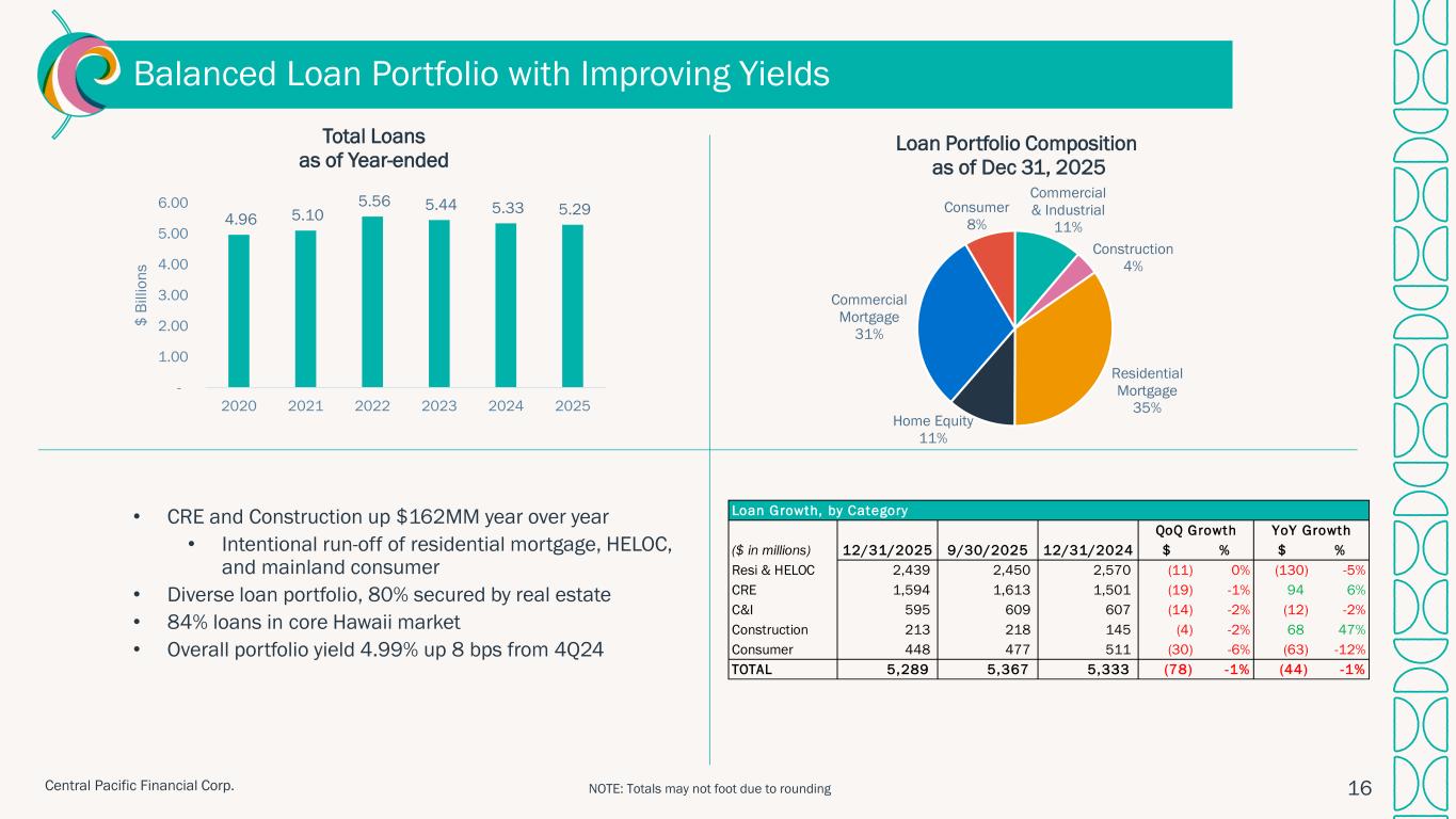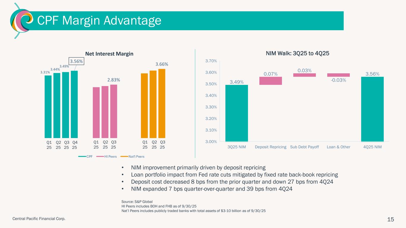 ハワイ州ホノルル、2026年1月28日 – セントラル・パシフィック・フィナンシャル・コーポレーション(NYSE: CPF)(以下「当社」)は、セントラル・パシフィック銀行(以下「当行」または「CPB」)の親会社として、2025年第4四半期の純利益が2,290万ドル(完全希薄化後1株当たり利益「EPS」0.85ドル)であったことを本日発表しました。 これは、前四半期の純利益1,860万ドル(1株当たり利益0.69ドル)、前年同期の純利益1,130万ドル(1株当たり利益0.42ドル)と比較したものである。 2025年通期では、純利益とEPSはそれぞれ7,750万ドル、2.86ドルとなり、2024年の純利益5,340万ドル、EPS1.97ドルから増加した。