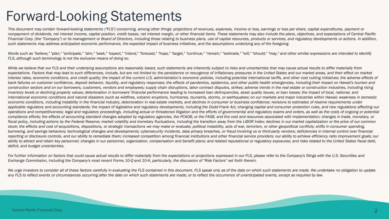 本文書には、とりわけ以下の事項に関する将来予測に関する記述(「FLS」)が含まれる場合があります:収益、費用、利益または損失、1株当たり利益または損失、資本支出、配当金の支払いまたは不支払い、純利息収益、資本状況、信用損失、純利息マージン、その他の財務項目に関する予測。 これらの記述には、セントラル・パシフィック・ファイナンシャル・コーポレーション(以下「当社」)またはその経営陣もしくは取締役会の計画、目標、見通し(事業計画、資本資源の活用、製品またはサービス、規制上の動向または措置に関するものを含む)も含まれる場合があります。さらに、こうした記述は、予想される経済的パフォーマンス、事業施策の予想される影響、および前述のいずれかの前提となる仮定についても言及する場合があります。