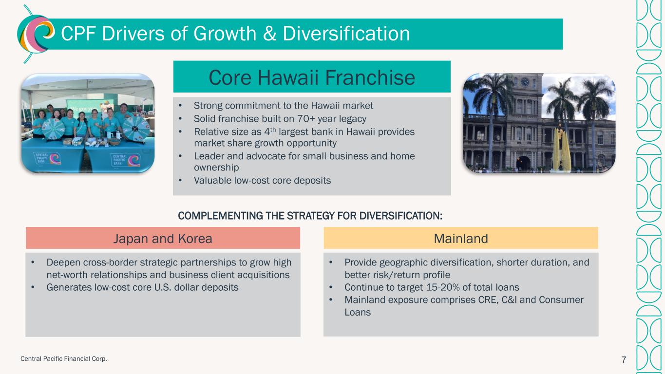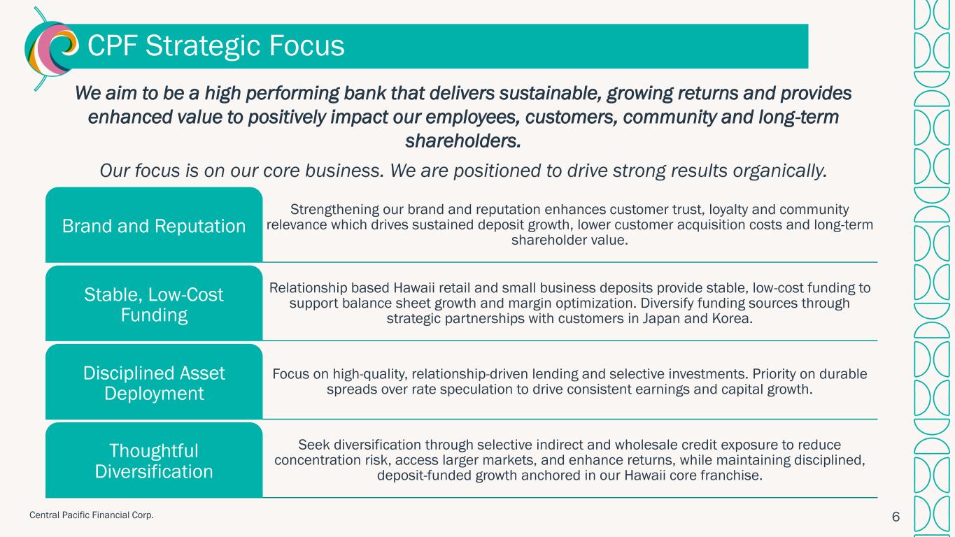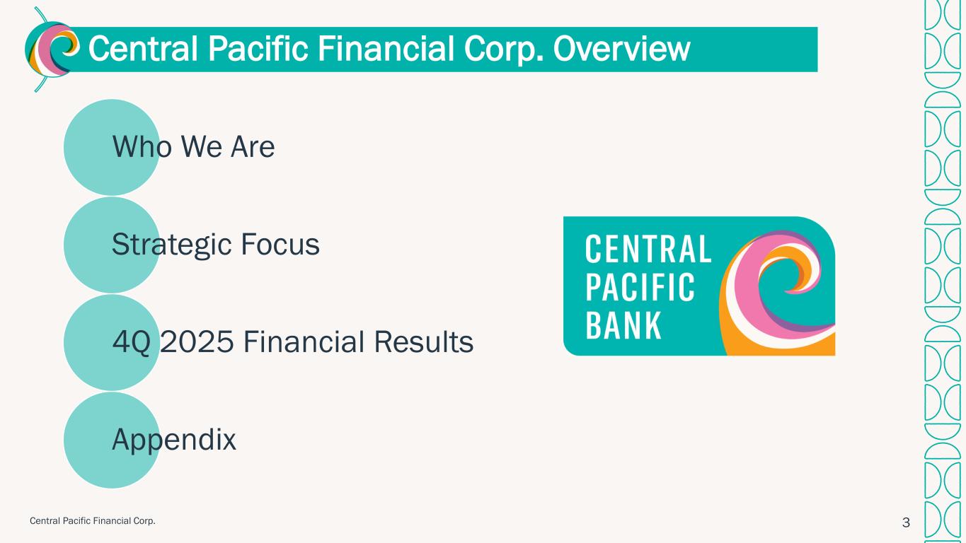 セントラル・パシフィック・フィナンシャル・コーポレーションは、ハワイに本拠を置く銀行持株会社であり、2025年12月31日現在、約74億1,000万ドルの資産を有しています。主要子会社であるセントラル・パシフィック銀行は、ハワイ州内に27支店と55台のATMを運営しています。セントラル・パシフィック・フィナンシャル・コーポレーションは、ニューヨーク証券取引所に「CPF」の銘柄コードで上場しています。詳細については、以下のURLをご覧ください:cpb.bank.