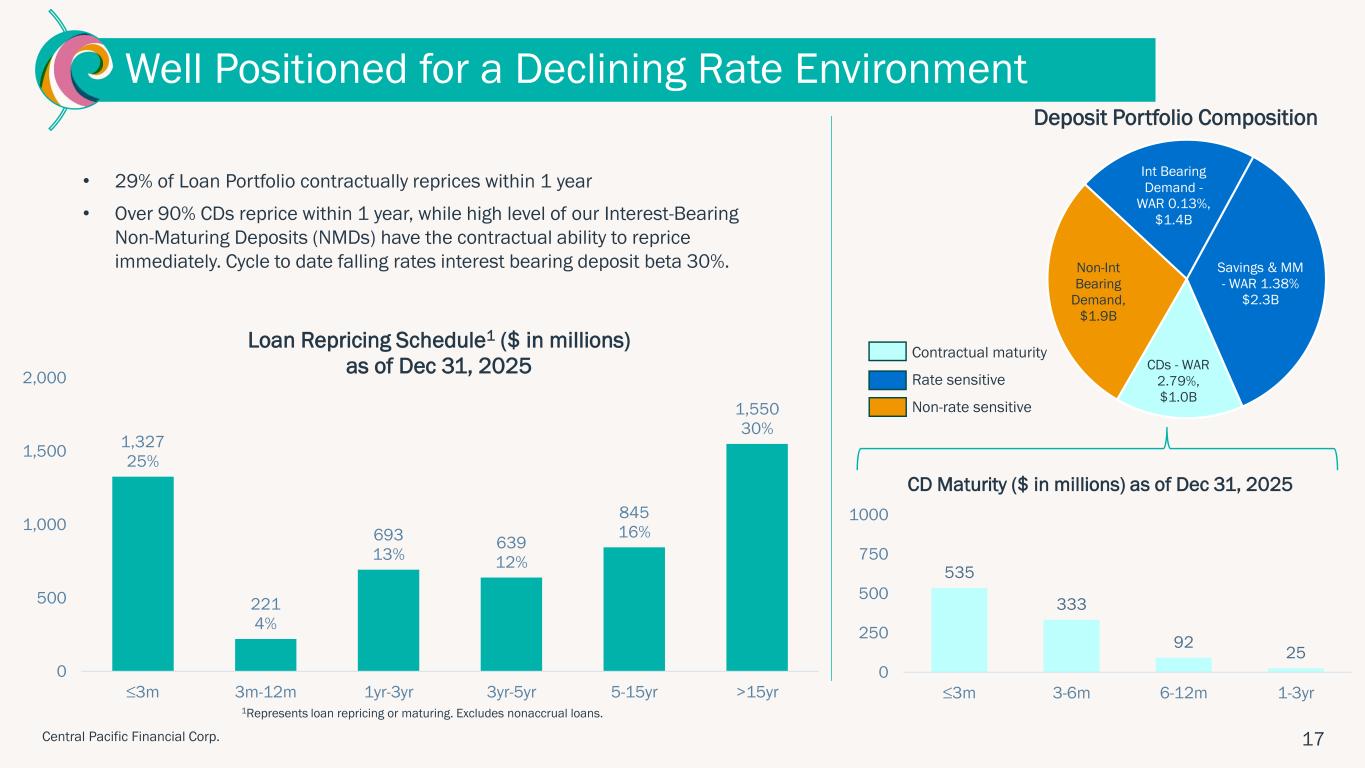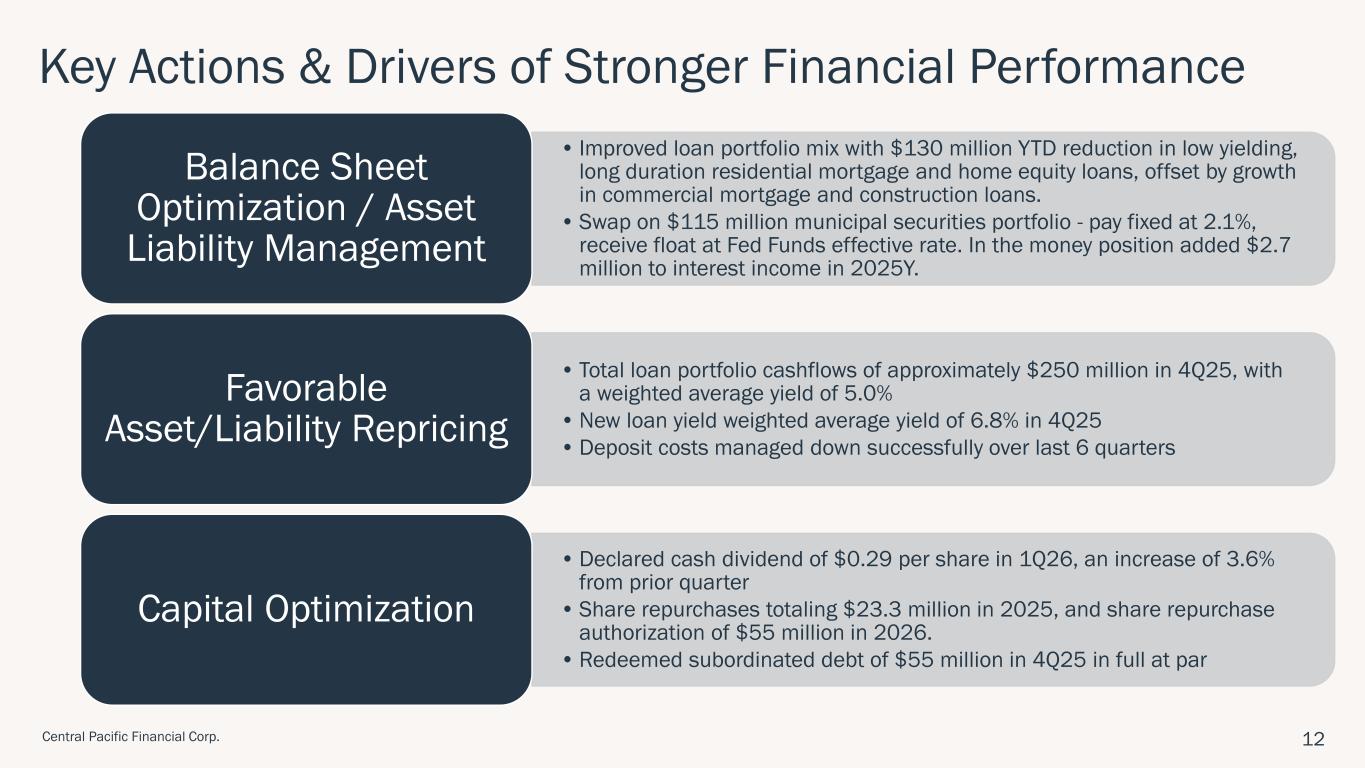 「セントラル・パシフィック・ファイナンシャルは、強力なバランスシート管理と、戦略的および事業上の優先事項における有意義な進展により、第4四半期および2025年度末の堅調な業績を達成しました」と、会長兼社長兼最高経営責任者(CEO)のアーノルド・マーティンズは述べています。「第4四半期には、当社の収益性がさらに強化され、規律あるアプローチの成功が強調されました。今後も、株主の皆様のために長期的な価値を創出し続ける一方で、お客様や当社がサービスを提供するコミュニティの支援に注力してまいります。」