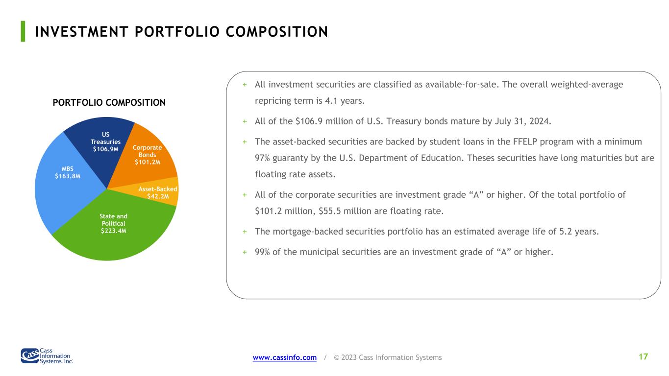 当社の業績は、運賃下落の結果、輸送顧客から発生する支払フロートが減少したこと、およびキャス・コマーシャル・バンクの顧客から発生する預金残高が減少したことにより影響を受けている。これらの供給源からの資金調達の減少は、短期投資の金利収入を得る能力に影響を及ぼしている。また、決済事業におけるテクノロジー・プラットフォームの更新とアップグレードの結果、営業費用の増加が続いている。当社は、請求書の取り込みと処理に関する効率性の向上、新規顧客の獲得、純利鞘の拡大による純利 益の改善により、今後の四半期では 2023 年第 2 四半期と比較して収益水準が改善すると予想しています。