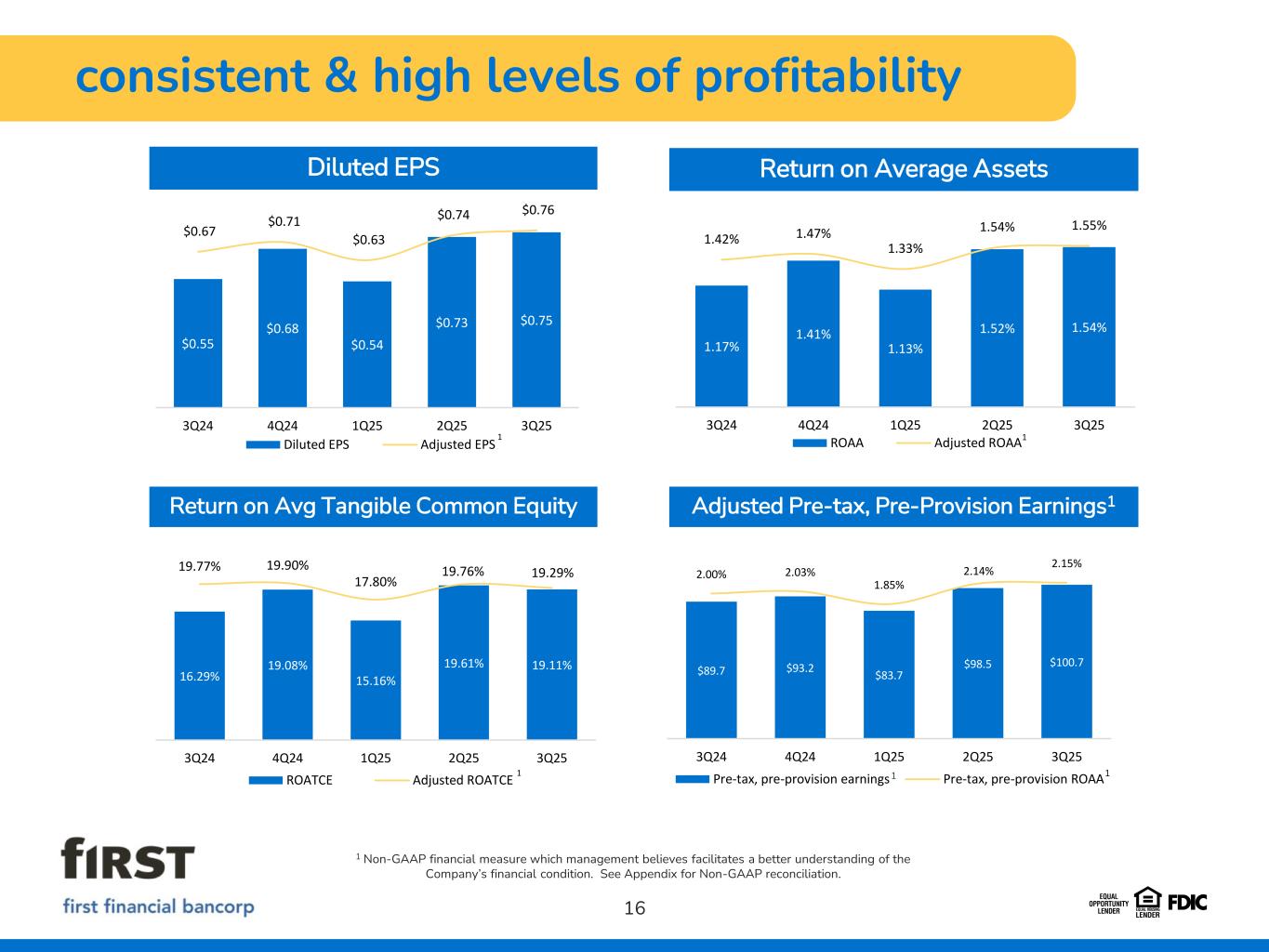 3Q 2025 results 140th Consecutive Quarter of Profitability 15 • EOP assets decreased $79.7 million compared to the linked quarter to $18.6 billion • EOP loans decreased $71.6 million compared to the linked quarter to $11.7 billion • Average deposits increased $157.2 million compared to the linked quarter to $14.5 billion • EOP investment securities increased $34.6 million compared to the linked quarter Balance Sheet Profitability Asset Quality Income Statement Capital • Noninterest income – $73.5 million; $73.6 million as adjusted1 • Noninterest expense – $134.3 million; $133.3 million as adjusted1 • Efficiency ratio – 57.4%. Adjusted efficiency ratio1 – 57.0% • Effective tax rate of 20.7%. Adjusted effective tax rate1 of 20.8% • Net interest income – $160.5 million • Net interest margin of 3.99% on a GAAP basis; 4.02% on a fully tax equivalent basis1 • Net income – $71.9 million or $0.75 per diluted share. Adjusted net income1 – $72.6 million or $0.76 per diluted share • Return on average assets – 1.54%. Adjusted return on average assets1 – 1.55% • Return on average shareholders’ equity – 11.08%. Adjusted return on average shareholders’ equity1 – 11.19% • Return on average tangible shareholders’ equity – 19.11%. Adjusted return on average tangible shareholders’ equity1 – 19.29% • Provision expense – $9.1 million • Net charge-offs – $5.2 million. NCOs / Avg. Loans – 0.18% annualized • Classified Assets / Total Assets – 1.18% • NPA / Total Assets – 0.41% • ACL / Total Loans – 1.38% • Total capital ratio – 15.32% • Tier 1 common equity ratio – 12.91% • Tangible common equity ratio – 8.87%. Adjusted tangible common equity ratio1 – 10.15% • Tangible book value per share – $16.19 1 Non-GAAP financial measure which management believes facilitates a better understanding of the Company’s financial condition. See Appendix for Non-GAAP reconciliation.