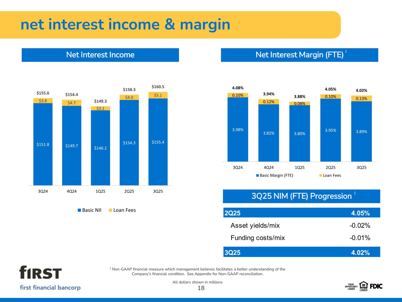 diversified & growing fee revenues 17 Noninterest Income 1 Non-GAAP financial measure which management believes facilitates a better understanding of the Company’s financial condition. See Appendix for Non-GAAP reconciliations. 3Q25 Highlights • Adjusted noninterest income1 31% of net revenue • Foreign exchange income of $16.7 million; increased $2.9 million, or 21.1% from linked quarter • Mortgage banking income of $6.8 million; increased $0.1 million, or 2.2% from linked quarter • Leasing business income of $21.0 million; increased $0.2 million, or 1.0% from the linked quarter • Other income of $8.4 million; increased $2.8 million, or 50.1% from the linked quarter All dollars shown in millions Service Charges $7.8 11% Wealth Mgmt $7.4 10% Bankcard $3.6 5% Client derivative fees $1.9 2% Foreign exchange $16.7 23% Leasing business $21.0 29% Mortgage banking $6.8 9% Other $8.4 11% Total $73.5 million $73.6 million as adjusted 1