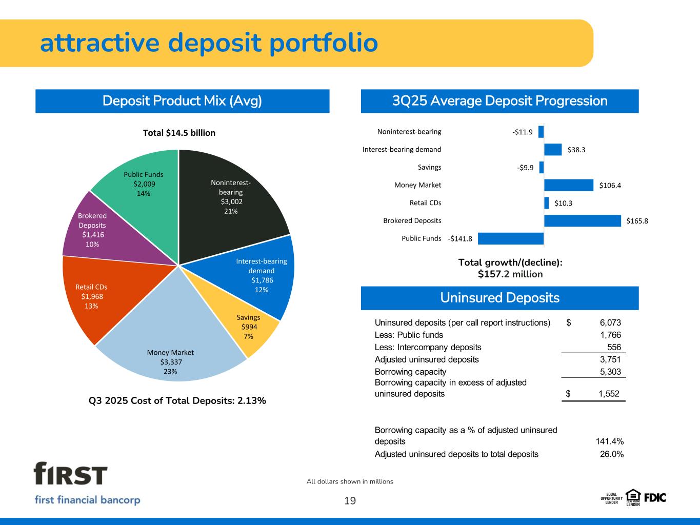 net interest income & margin 18 3Q25 NIM (FTE) Progression Net Interest Income All dollars shown in millions 3.89%3.95% 3.80%3.82% 3.98% 0.13%0.10% 0.08%0.12% 0.10% 4.02%4.05% 3.88% 3.94% 4.08% 3Q252Q251Q254Q243Q24 Basic Margin (FTE) Loan Fees Net Interest Margin (FTE) 2Q25 4.05% Asset yields/mix -0.02% Funding costs/mix -0.01% 3Q25 4.02% 1 1 Non-GAAP financial measure which management believes facilitates a better understanding of the Company’s financial condition. See Appendix for Non-GAAP reconciliation. $155.4$154.3 $146.2 $149.7$151.8 $5.1$4.0 $3.1 $4.7$3.8 $160.5 $158.3 $149.3 $154.4$155.6 3Q252Q251Q254Q243Q24 Basic NII Loan Fees 1