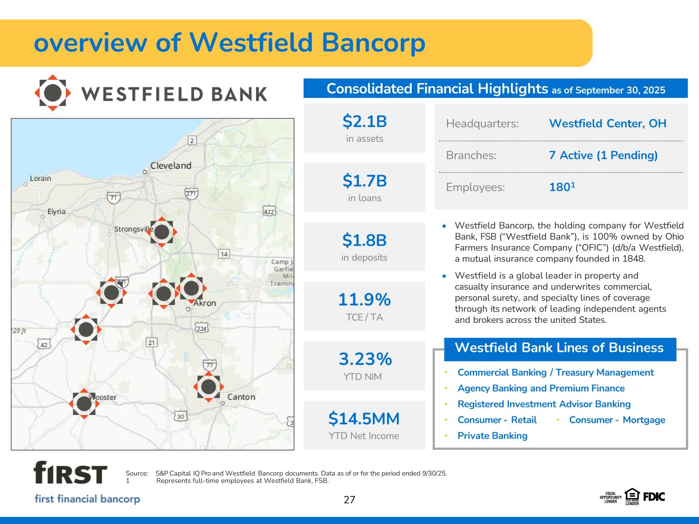 27 overview of Westfield Bancorp Westfield Bank Lines of Business • Commercial Banking / Treasury Management • Agency Banking and Premium Finance • Registered Investment Advisor Banking • Consumer - Retail • Consumer - Mortgage • Private Banking 3.23% YTD NIM $2.1B in assets Consolidated Financial Highlights as of September 30, 2025 $1.7B in loans $1.8B in deposits 11.9% TCE / TA $14.5MM YTD Net Income Headquarters: Westfield Center, OH Branches: 7 Active (1 Pending) Employees: 1801 • Westfield Bancorp, the holding company for Westfield Bank, FSB (“Westfield Bank”), is 100% owned by Ohio Farmers Insurance Company (“OFIC”) (d/b/a Westfield), a mutual insurance company founded in 1848. • Westfield is a global leader in property and casualty insurance and underwrites commercial, personal surety, and specialty lines of coverage through its network of leading independent agents and brokers across the united States. Source: S&P Capital IQ Pro and Westfield Bancorp documents. Data as of or for the period ended 9/30/25. 1 Represents full-time employees at Westfield Bank, FSB.