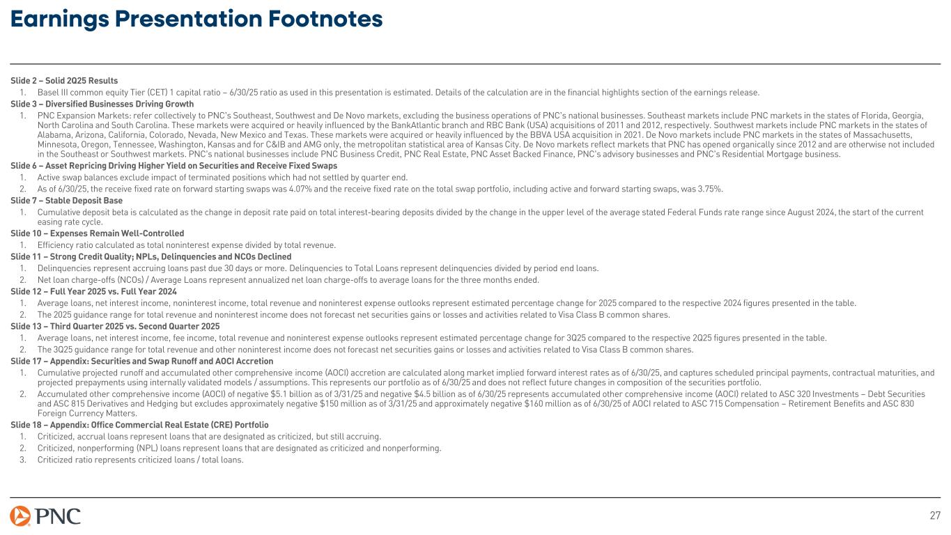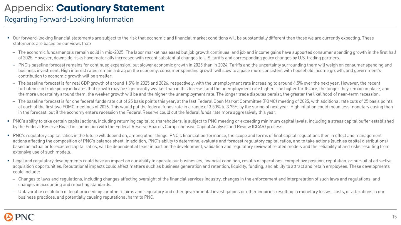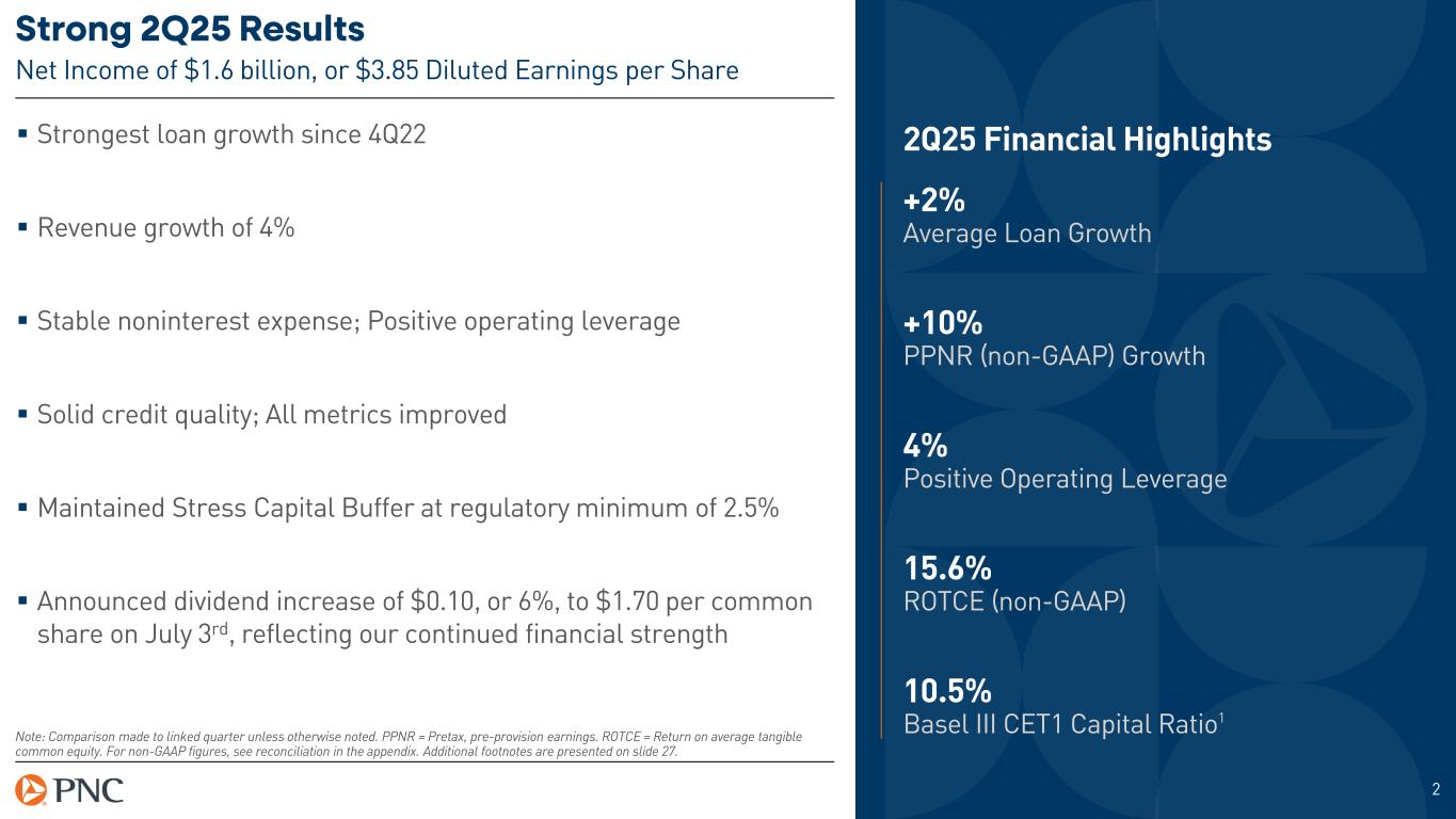 1 Cautionary Statement Regarding Forward-Looking and non-GAAP Financial Information Our earnings conference call presentation is not intended as a full business or financial review and should be viewed in the context of all of the information made available by PNC in its SEC filings and on our corporate website. The presentation contains forward-looking statements regarding our outlook for financial performance, such as earnings, revenues, expenses, tax rates, capital and liquidity levels and ratios, asset levels, asset quality, financial position, and other matters regarding or affecting PNC and its future business and operations, including sustainability strategy. Forward-looking statements are necessarily subject to numerous assumptions, risks and uncertainties, which change over time. The forward-looking statements in this presentation are qualified by the factors affecting forward- looking statements identified in the more detailed Cautionary Statement included in the Appendix. We provide greater detail regarding these as well as other factors in our most recent Form 10-K, any subsequent Form 10-Qs, and any subsequent SEC filings. Our forward-looking statements may also be subject to risks and uncertainties including those we may discuss in this presentation or in our SEC filings. Future events or circumstances may change our outlook and may also affect the nature of the assumptions, risks and uncertainties to which our forward-looking statements are subject. Forward-looking statements in this presentation speak only as of the date of this presentation. We do not assume any duty and do not undertake any obligation to update those statements. Actual results or future events could differ, possibly materially, from those anticipated in forward-looking statements, as well as from historical performance. As a result, we caution against placing undue reliance on any forward-looking statements. We include non-GAAP financial information in this presentation. Reconciliations for such financial information may be found in our presentation, in these slides, including the Appendix, in other materials on our corporate website, and in our SEC filings. This information supplements our results as reported in accordance with GAAP and should not be viewed in isolation from, or as a substitute for, our GAAP results. We believe that this information and the related reconciliations may be useful to investors, analysts, regulators and others to help understand and evaluate our financial results, and with respect to adjusted metrics, because we believe they better reflect the ongoing financial results and trends of our businesses and increase comparability of period-to-period results. We may also use annualized, pro forma, estimated or third party numbers for illustrative or comparative purposes only. These may not reflect actual results. References to our corporate website are to www.pnc.com under “About - Investor Relations.” Our SEC filings are available both on our corporate website and on the SEC’s website at www.sec.gov. We include web addresses here as inactive textual references only. Information on these websites is not part of this presentation.