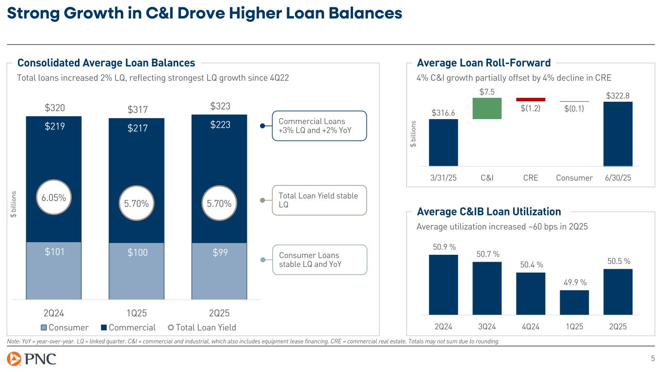 4 Increased Loans and Deposits Balance Sheet Summary Linked Quarter Year over Year Average balances, $ billions 2Q25 $ % $ % Total loans $322.8 $6.1 2% $2.8 1% Investment securities $141.9 $(0.2) – $0.6 – Federal Reserve Bank balances $30.8 $(3.4) (10)% $(9.9) (24)% Total deposits $423.0 $2.3 1% $5.7 1% Borrowed funds $65.3 $0.8 1% $(12.2) (16)% Common shareholders’ equity $50.7 $1.5 3% $5.8 13% Period end 6/30/25 3/31/25 LQ 6/30/24 YoY AOCI ($ billions) $(4.7) $(5.2) $0.6 $(7.4) $2.8 Tangible book value per common share (non-GAAP) $103.96 $100.40 4% $89.12 17% Basel III CET1 capital ratio 10.5% 10.6% (10) bps 10.2% 30 bps Note: AOCI = accumulated other comprehensive income (loss). YoY = year-over-year. LQ = linked quarter. Totals may not sum due to rounding. For non-GAAP figures, see reconciliation in the appendix.