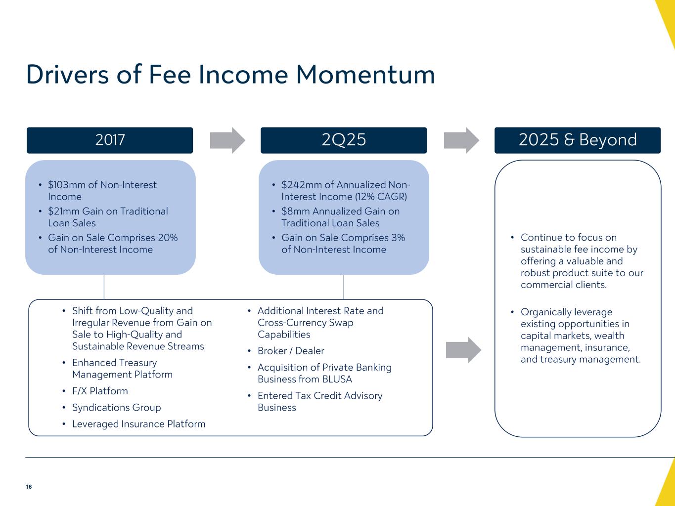-非金利収入:非金利収入は、主に資本市場収入および預金口座手数料がそれぞれ 280 万ドルおよび 200 万ドル増加したことによ り、2025 年第 2 四半期は前年同期から 430 万ドル増加し、6,260 万ドルとなりました。資本市場利益の増加は、主に 2025 年第 2 四半期に商業ローン顧客向けに実行された金利スワップ取引の量が増加したことによるものです。