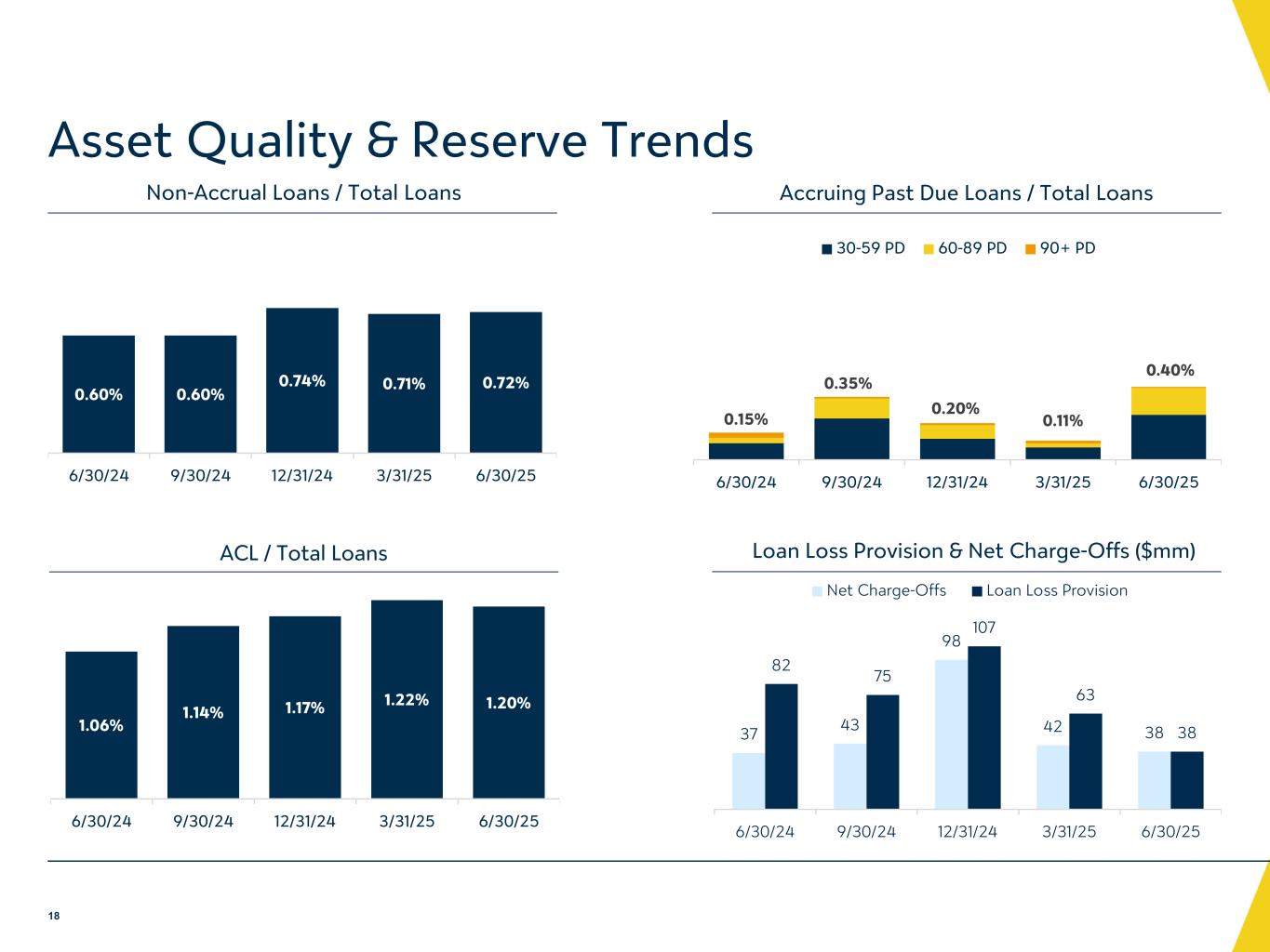 不良資産(NPAs)。未収ローン、その他保有不動産(OREO)およびその他差し押さえ資産で構成される不良債権総額は、2025年3月31日時点に比べ460万ドル増加し、2025年6月30日時点では3億6,080万ドルとなった。これは主に、2025 年第 2 四半期に CRE 向け不良債権が純増加したことによるものですが、C&I 向け不良 債権の減少により一部相殺されました。2025年3月31日現在のC&Iローンの不良債権は、主に2025年第2四半期中に4件のローン関係(総額 1,740万ドル)を全額償却したことにより減少しました。2025年3月31日時点ではローン総額の0.71%であったのに対し、2025年6月30日時点では0.72%となっている。2025年6月30日現在のOREOは、2025年3月31日時点から290万ドル減少して480万ドルとなったが、これは 主に2025年第2四半期に計上されたCRE物件1件の公正価値評価損によるものである。
