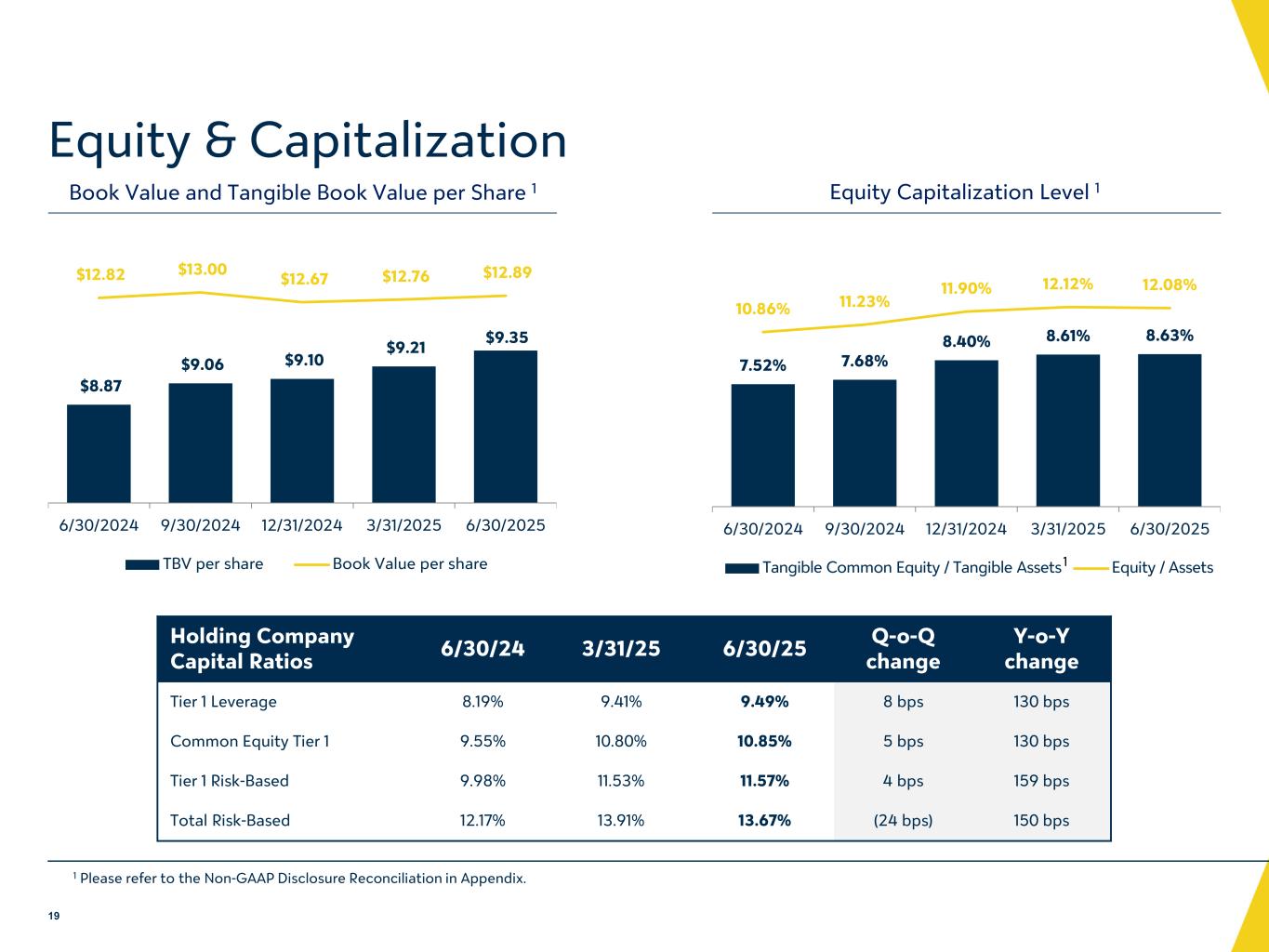 -パフォーマンス・レシオ:2025 年第 2 四半期の年率換算平均総資産利益率(ROA)は 0.86%、株主資本利益率(ROE)は 7.08%、有形 ROE は 9.62%であった。非中核事業利益および費用を調整した年率換算 ROA、ROE、有形 ROE は、それぞれ 0.87%、7.15%、9.71%でした。非 GAAP 指標に関する追加情報については、以下の「連結財務ハイライト」の表をご参照ください。