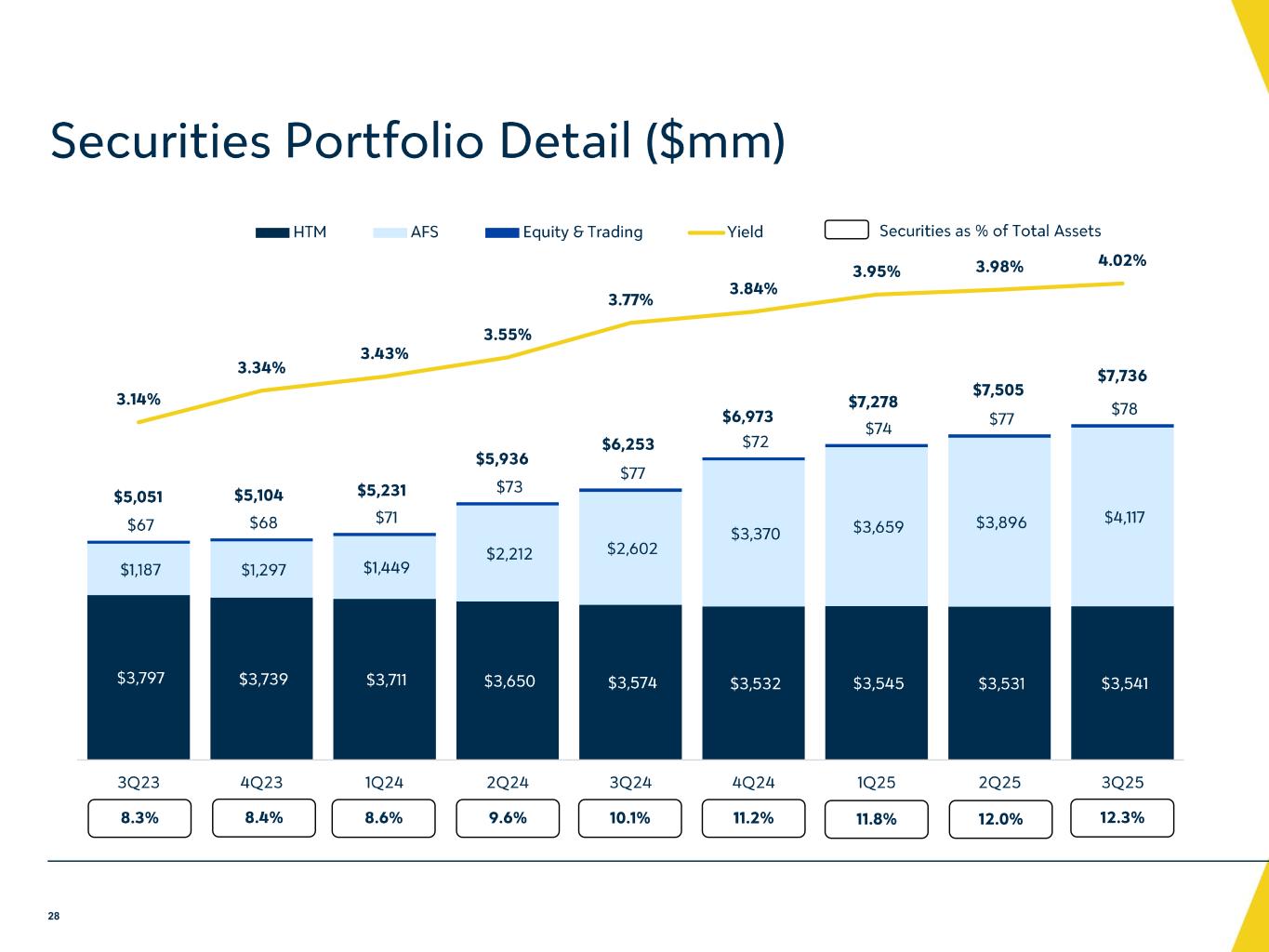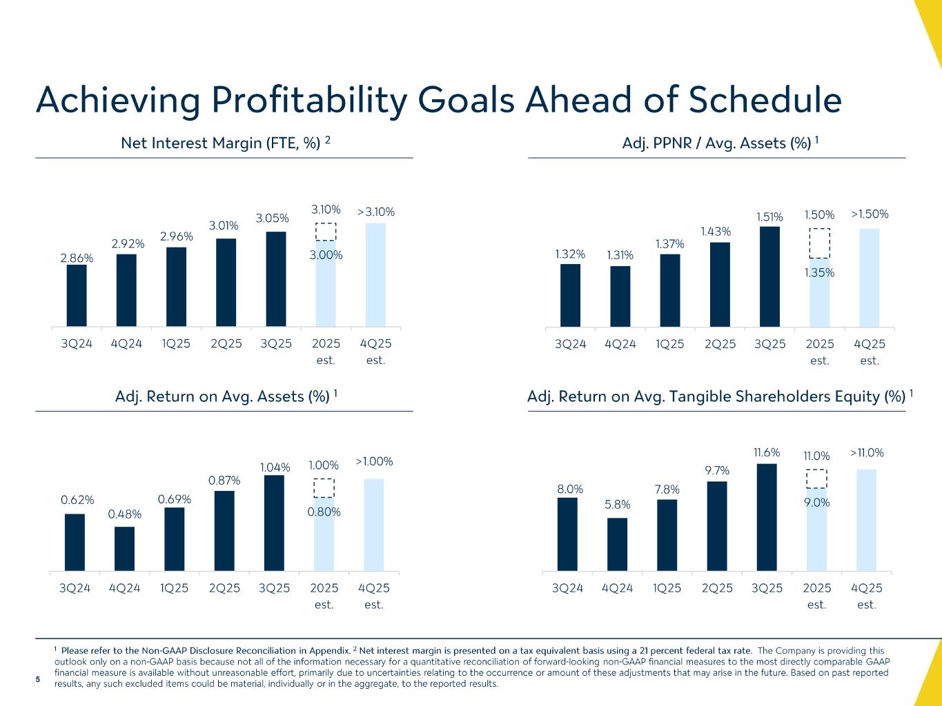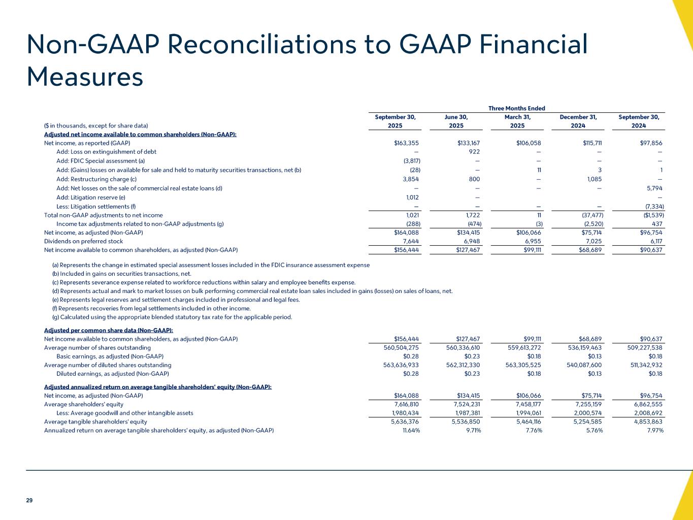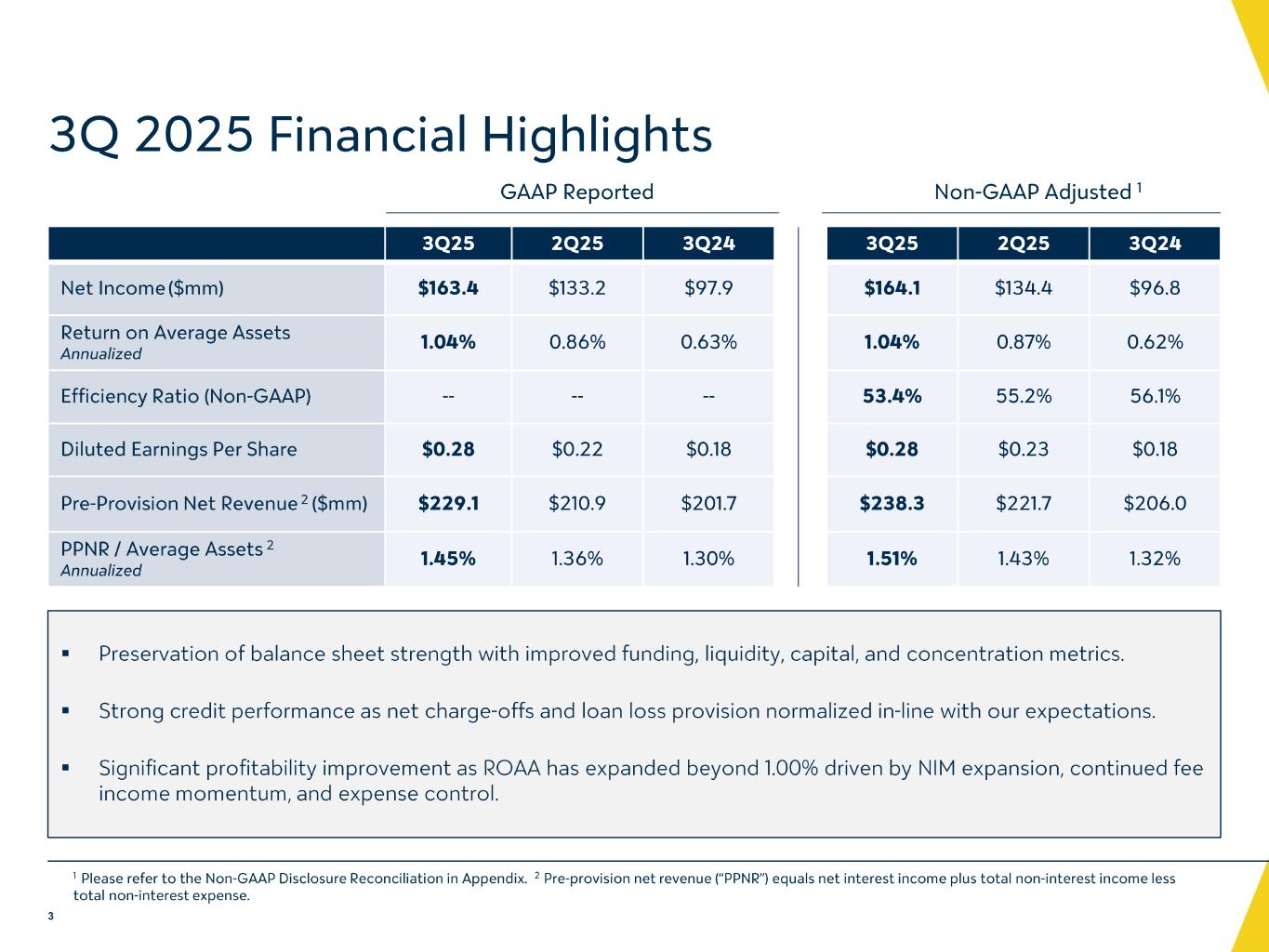 -パフォーマンス・レシオ:2025 年第 3 四半期の年率換算平均総資産利益率(ROA)は 1.04%、株主資本利益率(ROE)は 8.58%、有形 ROE は 11.59%であった。非中核事業利益および費用を調整した年率換算 ROA、ROE、有形 ROE は、2025 年度第 3 四半期にそれぞれ 1.04%、8.62%、11.64%となりました。収益性比率は引き続き着実に改善しており、2025年第3四半期の調整後年率換算ROAは2022年第4四半期以来の高水準に回復しました。当社の非GAAP指標に関する追加情報については、以下の「連結財務ハイライト」の表をご参照ください。