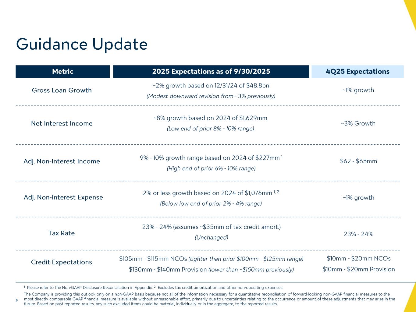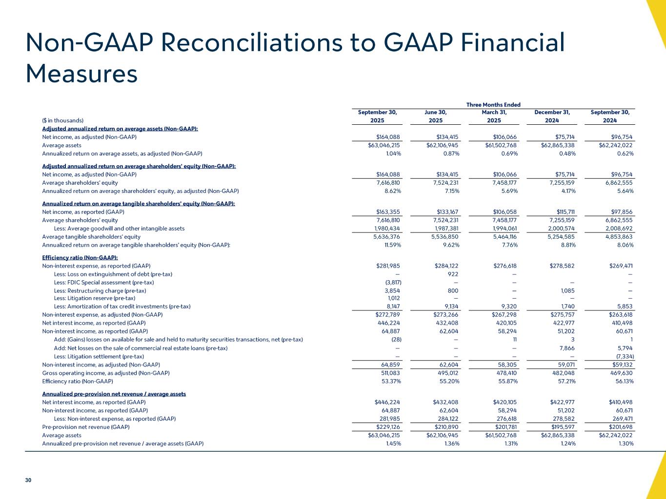 -信用の質:信用の質:正味貸倒償却額は、2025 年第 2 四半期が 3,780 万ドル、2024 年第 3 四半期が 4,290 万ドルであったのに対し、2025 年第 3 四半期は 1,460 万ドルとなりました。延滞債権(支払期日が 30 日以上経過し、なおかつ利息が発生している債権)は、2025 年 6 月 30 日時点の 1 億 9,920 万ドル(同 0.40%)に対し、2025 年 9 月 30 日時点では 1 億 1,440 万ドル減少し、8,480 万ドル(同 0.17%)となりました。2025年9月30日現在、未収利息不計上貸出金は4億2,150万ドル(貸出金総額の0.86%)であったのに対し、2025年6月30日現在では3億5,440万ドル(貸出金総額の0.72%)であった。不良債権の増加は、主に3件の新規不良債権(合計6,700万ドル)によるものである。これらの貸出金は、大部分が十分に担保に供されており、2025年9月30日現在、貸倒引当金には総額880万ドルの引当金が計上されている。詳細は下記の「信用の質」の項を参照されたい。