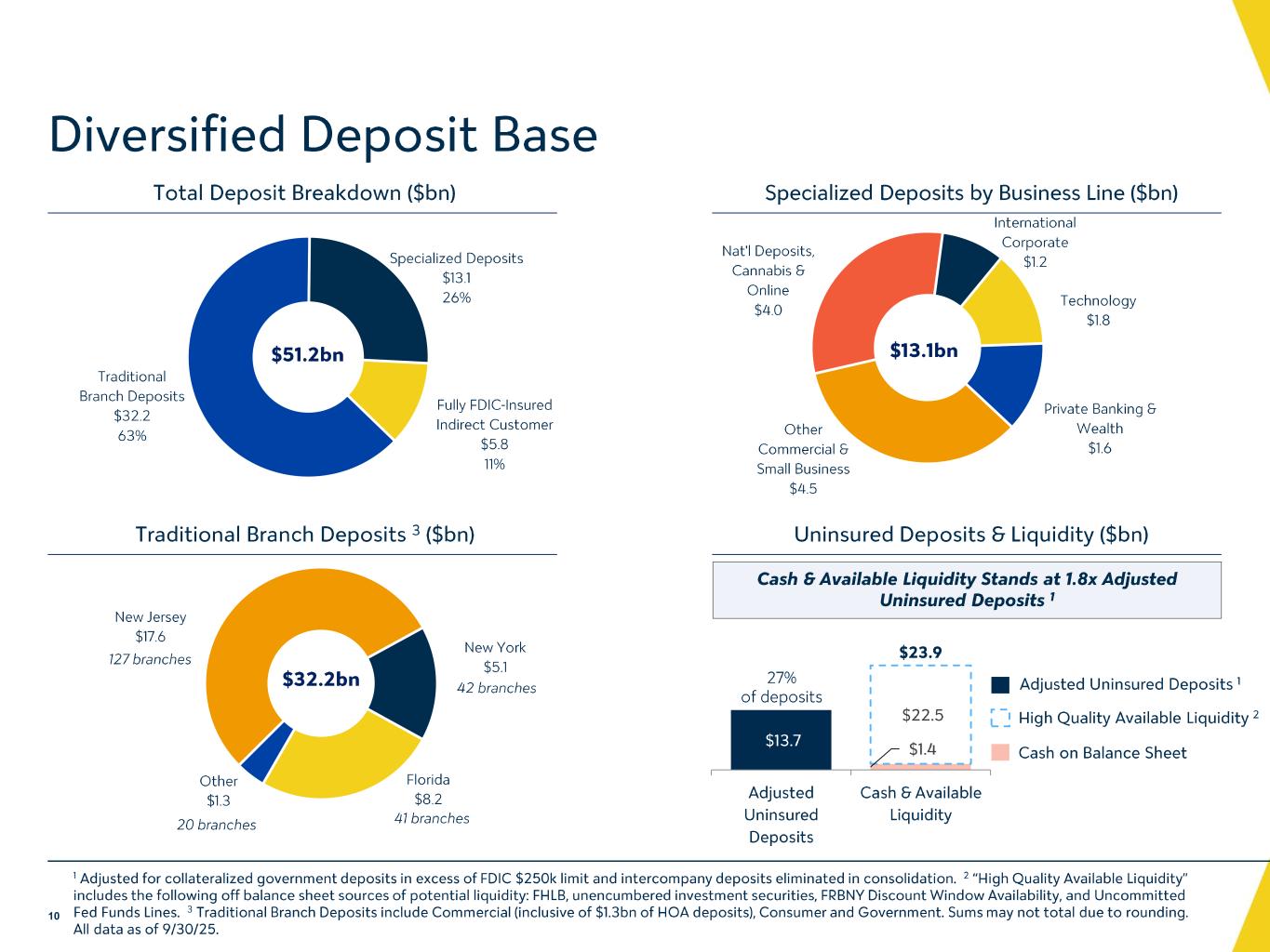 預金2025年9月30日現在の預金残高は、2025年6月30日時点から4億5,050万ドル増加し、512億ドルとなった。これは主に、普通預金、NOWおよび短期金融市場預金の残高が12億ドル増加したことによるもので、定期預金の6億1,680万ドルの減少により一部相殺された。2025年6月30日時点からの普通預金、NOWおよび短期金融市場預金残高の増加は、主に商業顧客および政府預金口座からの預金流入によるものである。定期預金残高の減少は主に、2025年第3四半期中に満期を迎えた間接的顧客CDの返済によるものである。2025年9月30日および2025年6月30日現在の間接顧客預金残高(ブローカー定期預金および短期金融市場預金から構成)は、それぞれ58億ドルおよび65億ドルであった。2025 年 9 月 30 日および 2025 年 6 月 30 日現在の無利息預金残高は約 117 億ドルで、2025 年第 3 四半期中、当行の顧客基盤全体では比較的安定していました。2025年9月30日現在、無利息預金、貯蓄預金、NOW預金、短期金融市場預金、定期預金は、それぞれ預金総額の約23%、53%、24%を占めており、2025年6月30日現在、それぞれ預金総額の23%、52%、25%を占めていました。