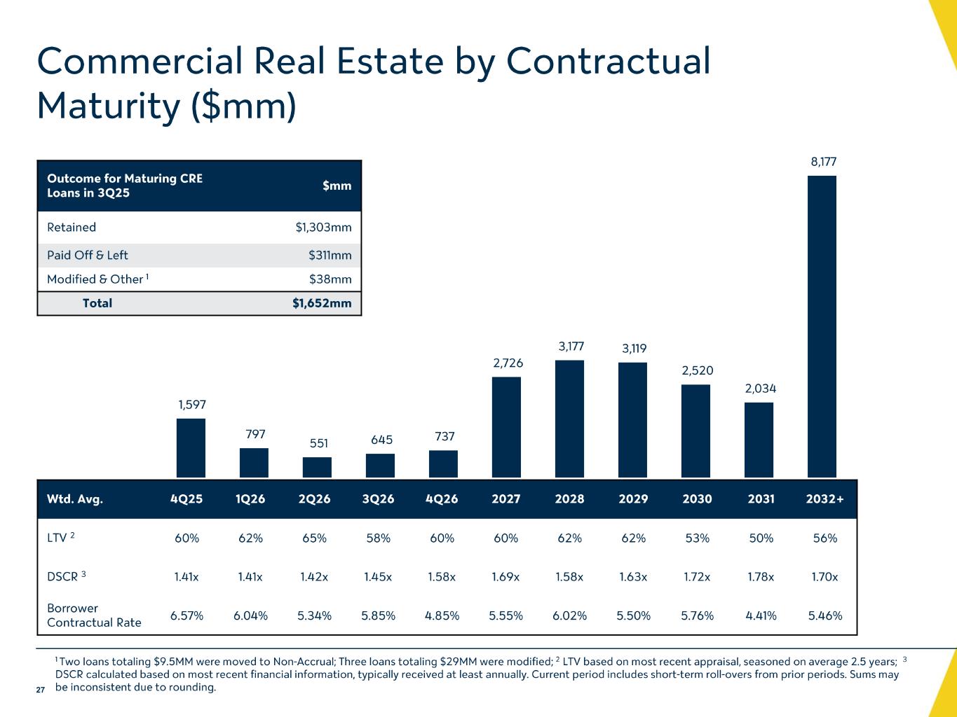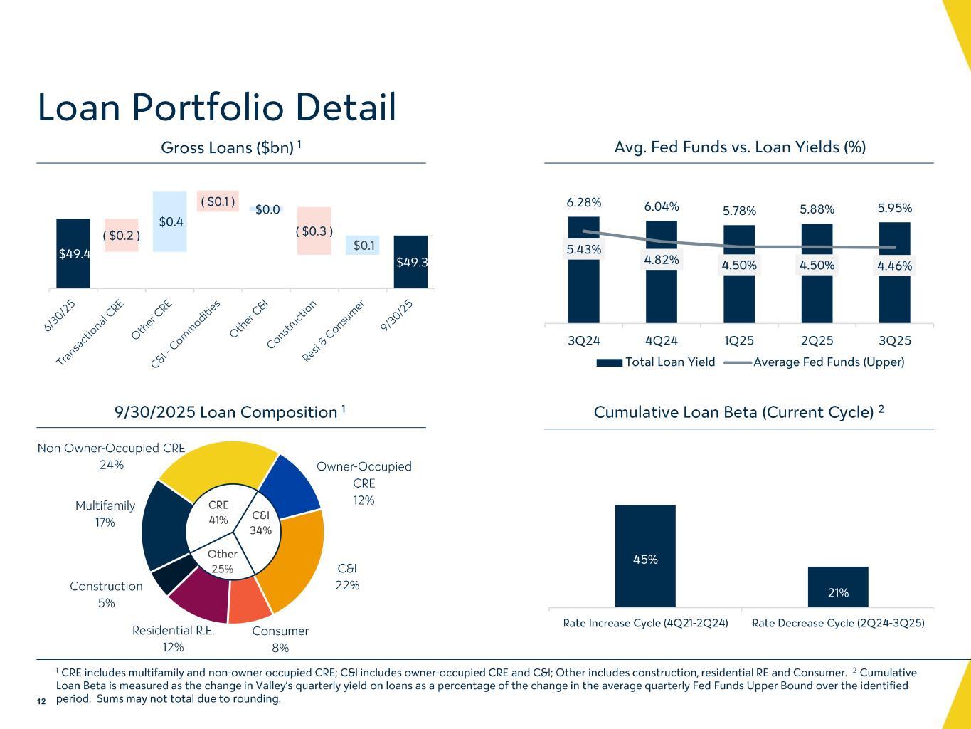 貸出金2025年9月30日現在の貸出金合計は、2025年6月30日時点から1億1,860万ドル(年率換算で1.0%)減少し、493億ドルとなった。2025年9月30日現在のCRE(建設資金を含む)ローン総額は、2025年6月30日時点から1億4,250万ドル減少して287億ドルとなった。建設ローンは、2025年9月30日時点で、2025年6月30日時点から3億3,760万ドル(年率換算で47.3%)減少し、25億ドルとなった。建設ローンの減少は主に、2025年第3四半期中にCREローン・ポートフォリオの非所有者向けローン・カテゴリーと所有者向けローン・カテゴリーの両方において、返済または恒久的資金調達に移行した既存プロジェクトが完了したことによるものです。この移行と新規組成の結果、2025年9月30日現在の所有者向けCREローンは、2025年6月30日時点から3億790万ドル(年率換算で21.3%)増加した。2025年9月30日現在、非所有者向けCREローンは7,340万ドル、複合住宅向けCREローンは3,950万ドル、それぞれ2025年6月30日から減少した。2025年9月30日現在のC&Iローンは、2025年6月30日時点から1億1,220万ドル(年率換算で4.1%)減少して108億ドルと なりましたが、これは主に2025年第3四半期に商品産業向けの小口融資の返済があったことによるものです。2025年9月30日現在の住宅ローン残高は、新規貸出が返済を上回ったため、前年同期から8,540万ドル増加し、 58億ドルとなった。消費者ローン総額は、2025年9月30日現在、主にホーム・エクイティ・ラインの利用および新規貸付の実行、 その他の顧客ローン・カテゴリーの緩やかな増加により、2025年6月30日時点から5070万ドル増加して40億ドルと なった。売却予定の営業貸付金は、2025年9月30日現在、2025年6月30日時点から1,020万ドル減少して1,810万ドルと なった。これは主に、1,020万ドルの不良建設貸付金を無関係の第三者に売却したことによるものである。この不良債権売却により、2025年第3四半期の貸出金売却益の中で130万ドルの損失が認識されました。
