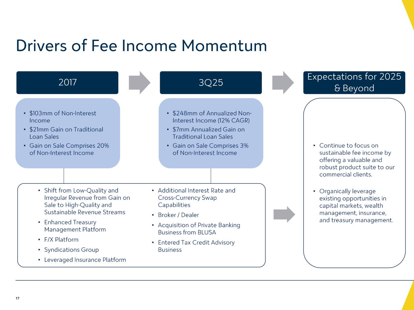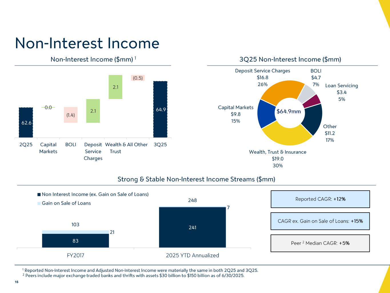 -非金利収入:非金利収入:2025 年第 3 四半期の非金利収入は、主に預金口座手数料および資産管理・信託手数料が 210 万ドル増加したことにより、前年同期から 230 万ドル増加し、6,490 万ドルとなりました。増加の主な要因は、商業預金顧客向けのトレジャリー・サービス料、ブローカー手数料、税額控除アドバイザリー・サービス料の増加によるものです。これらの増加は、2025 年第 3 四半期の銀行保有生命保険収益および貸出金売却益の減少により一部相殺されまし た。