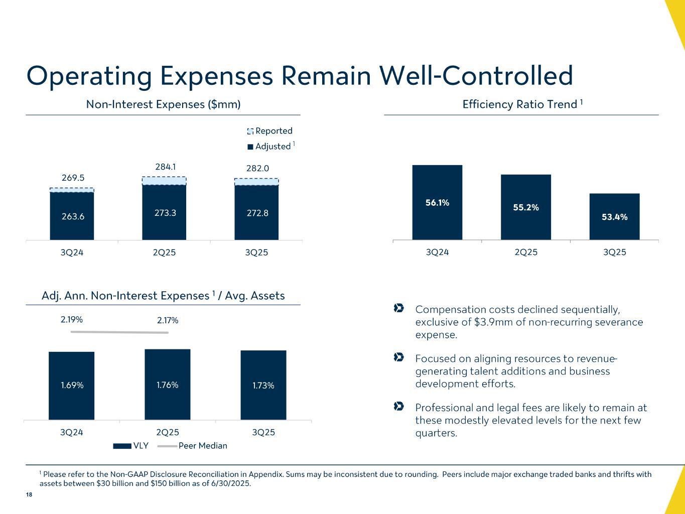 -非金利費用:2025 年第 3 四半期の非金利費用は、第 2 四半期に比べ 210 万ドル減少し、282.0 万ドルとなりました。これは主に、予想される特別評価額の減少を反映し、FDIC 保険評価費用が 380 万ドル減少したことによるものです。また、2025 年第 3 四半期のその他の非金利費用は 160 万ドル、債務消滅損失は 92.2 万ドル減少しました。これらの減少は、コンサルティング費用および弁護士費用の増加による専門家および弁護士費用の430万ドルの増加により、ほぼ相殺されました。給与および従業員福利厚生費も140万ドル増加しましたが、これは主にリストラ関連の退職金が310万ドル増加したことによるもので、給与税が減少したことにより一部相殺されました。FDIC特別査定費用および退職金を含む非中核項目に関する追加情報については、以下の「連結財務ハイライト」の表をご参照ください。