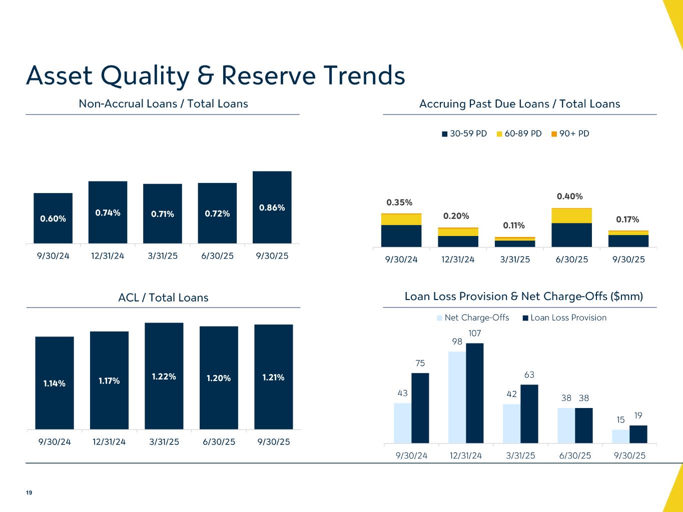 不良資産(NPAs)。2025年9月30日現在の不良債権総額は、2025年6月30日時点に比べ6,660万ドル増加し、4億2,730万ド ルとなりました。2025年9月30日時点の未収ローンは、2025年6月30日時点の3億5,440万ドル(ローン総数の0.72%)から6,710万ドル増加し、4億2,150万ドル(ローン総数の0.86%)となった。この増加は主に、2025年6月30日時点で30~59日の延滞カテゴリーから移行した3,500万ドルの建設ローンと、2件の小規模な不良CREローンによるものですが、2025年第3四半期中に売却目的保有に分類された1,020万ドルの不良建設ローンの売却により一部相殺されました。