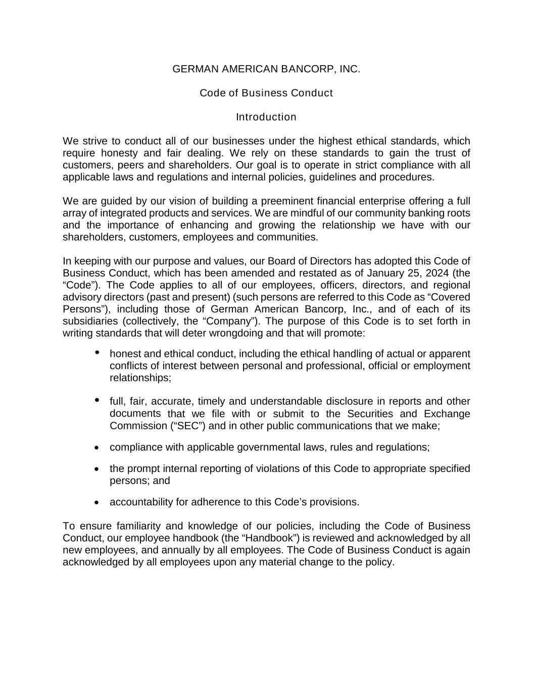 GERMAN AMERICAN BANCORP, INC. Code of Business Conduct Introduction We strive to conduct all of our businesses under the highest ethical standards, which require honesty and fair dealing. We rely on these standards to gain the trust of customers, peers and shareholders. Our goal is to operate in strict compliance with all applicable laws and regulations and internal policies, guidelines and procedures. We are guided by our vision of building a preeminent financial enterprise offering a full array of integrated products and services. We are mindful of our community banking roots and the importance of enhancing and growing the relationship we have with our shareholders, customers, employees and communities. In keeping with our purpose and values, our Board of Directors has adopted this Code of Business Conduct, which has been amended and restated as of January 25, 2024 (the “Code”). The Code applies to all of our employees, officers, directors, and regional advisory directors (past and present) (such persons are referred to this Code as “Covered Persons”), including those of German American Bancorp, Inc., and of each of its subsidiaries (collectively, the “Company”). The purpose of this Code is to set forth in writing standards that will deter wrongdoing and that will promote: honest and ethical conduct, including the ethical handling of actual or apparent conflicts of interest between personal and professional, official or employment relationships; full, fair, accurate, timely and understandable disclosure in reports and other documents that we file with or submit to the Securities and Exchange Commission (“SEC”) and in other public communications that we make; • compliance with applicable governmental laws, rules and regulations; • the prompt internal reporting of violations of this Code to appropriate specified persons; and • accountability for adherence to this Code’s provisions. To ensure familiarity and knowledge of our policies, including the Code of Business Conduct, our employee handbook (the “Handbook”) is reviewed and acknowledged by all new employees, and annually by all employees. The Code of Business Conduct is again acknowledged by all employees upon any material change to the policy.