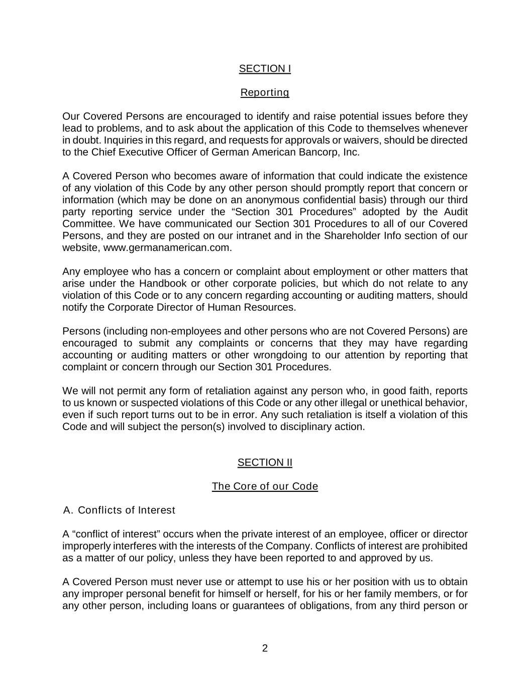 2 SECTION I Reporting Our Covered Persons are encouraged to identify and raise potential issues before they lead to problems, and to ask about the application of this Code to themselves whenever in doubt. Inquiries in this regard, and requests for approvals or waivers, should be directed to the Chief Executive Officer of German American Bancorp, Inc. A Covered Person who becomes aware of information that could indicate the existence of any violation of this Code by any other person should promptly report that concern or information (which may be done on an anonymous confidential basis) through our third party reporting service under the “Section 301 Procedures” adopted by the Audit Committee. We have communicated our Section 301 Procedures to all of our Covered Persons, and they are posted on our intranet and in the Shareholder Info section of our website, www.germanamerican.com. Any employee who has a concern or complaint about employment or other matters that arise under the Handbook or other corporate policies, but which do not relate to any violation of this Code or to any concern regarding accounting or auditing matters, should notify the Corporate Director of Human Resources. Persons (including non-employees and other persons who are not Covered Persons) are encouraged to submit any complaints or concerns that they may have regarding accounting or auditing matters or other wrongdoing to our attention by reporting that complaint or concern through our Section 301 Procedures. We will not permit any form of retaliation against any person who, in good faith, reports to us known or suspected violations of this Code or any other illegal or unethical behavior, even if such report turns out to be in error. Any such retaliation is itself a violation of this Code and will subject the person(s) involved to disciplinary action. SECTION II The Core of our Code A. Conflicts of Interest A “conflict of interest” occurs when the private interest of an employee, officer or director improperly interferes with the interests of the Company. Conflicts of interest are prohibited as a matter of our policy, unless they have been reported to and approved by us. A Covered Person must never use or attempt to use his or her position with us to obtain any improper personal benefit for himself or herself, for his or her family members, or for any other person, including loans or guarantees of obligations, from any third person or