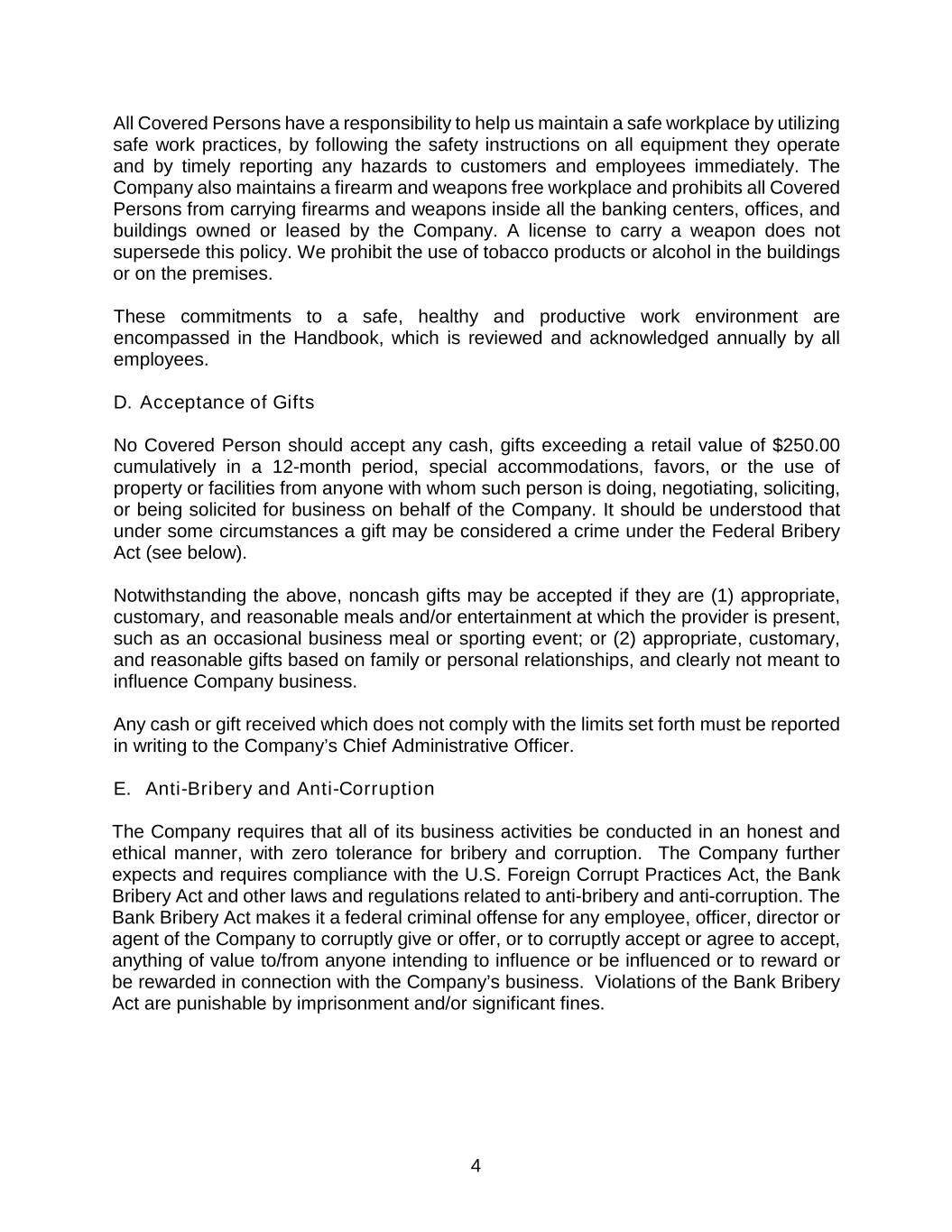 4 All Covered Persons have a responsibility to help us maintain a safe workplace by utilizing safe work practices, by following the safety instructions on all equipment they operate and by timely reporting any hazards to customers and employees immediately. The Company also maintains a firearm and weapons free workplace and prohibits all Covered Persons from carrying firearms and weapons inside all the banking centers, offices, and buildings owned or leased by the Company. A license to carry a weapon does not supersede this policy. We prohibit the use of tobacco products or alcohol in the buildings or on the premises. These commitments to a safe, healthy and productive work environment are encompassed in the Handbook, which is reviewed and acknowledged annually by all employees. D. Acceptance of Gifts No Covered Person should accept any cash, gifts exceeding a retail value of $250.00 cumulatively in a 12-month period, special accommodations, favors, or the use of property or facilities from anyone with whom such person is doing, negotiating, soliciting, or being solicited for business on behalf of the Company. It should be understood that under some circumstances a gift may be considered a crime under the Federal Bribery Act (see below). Notwithstanding the above, noncash gifts may be accepted if they are (1) appropriate, customary, and reasonable meals and/or entertainment at which the provider is present, such as an occasional business meal or sporting event; or (2) appropriate, customary, and reasonable gifts based on family or personal relationships, and clearly not meant to influence Company business. Any cash or gift received which does not comply with the limits set forth must be reported in writing to the Company’s Chief Administrative Officer. E. Anti-Bribery and Anti-Corruption The Company requires that all of its business activities be conducted in an honest and ethical manner, with zero tolerance for bribery and corruption. The Company further expects and requires compliance with the U.S. Foreign Corrupt Practices Act, the Bank Bribery Act and other laws and regulations related to anti-bribery and anti-corruption. The Bank Bribery Act makes it a federal criminal offense for any employee, officer, director or agent of the Company to corruptly give or offer, or to corruptly accept or agree to accept, anything of value to/from anyone intending to influence or be influenced or to reward or be rewarded in connection with the Company’s business. Violations of the Bank Bribery Act are punishable by imprisonment and/or significant fines.