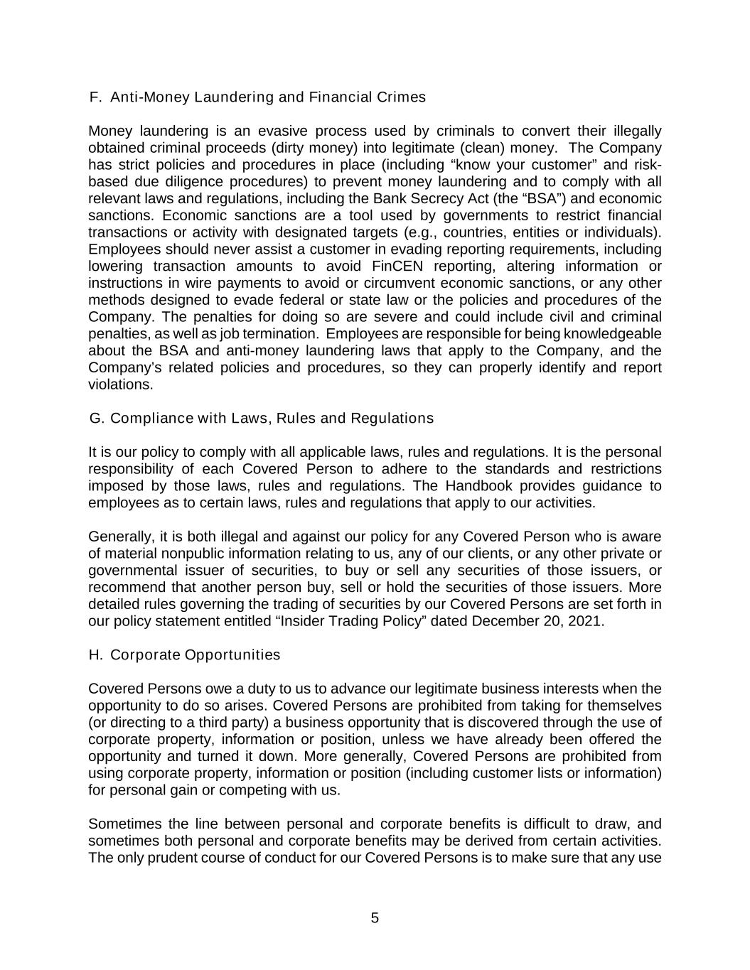 5 F. Anti-Money Laundering and Financial Crimes Money laundering is an evasive process used by criminals to convert their illegally obtained criminal proceeds (dirty money) into legitimate (clean) money. The Company has strict policies and procedures in place (including “know your customer” and risk- based due diligence procedures) to prevent money laundering and to comply with all relevant laws and regulations, including the Bank Secrecy Act (the “BSA”) and economic sanctions. Economic sanctions are a tool used by governments to restrict financial transactions or activity with designated targets (e.g., countries, entities or individuals). Employees should never assist a customer in evading reporting requirements, including lowering transaction amounts to avoid FinCEN reporting, altering information or instructions in wire payments to avoid or circumvent economic sanctions, or any other methods designed to evade federal or state law or the policies and procedures of the Company. The penalties for doing so are severe and could include civil and criminal penalties, as well as job termination. Employees are responsible for being knowledgeable about the BSA and anti-money laundering laws that apply to the Company, and the Company’s related policies and procedures, so they can properly identify and report violations. G. Compliance with Laws, Rules and Regulations It is our policy to comply with all applicable laws, rules and regulations. It is the personal responsibility of each Covered Person to adhere to the standards and restrictions imposed by those laws, rules and regulations. The Handbook provides guidance to employees as to certain laws, rules and regulations that apply to our activities. Generally, it is both illegal and against our policy for any Covered Person who is aware of material nonpublic information relating to us, any of our clients, or any other private or governmental issuer of securities, to buy or sell any securities of those issuers, or recommend that another person buy, sell or hold the securities of those issuers. More detailed rules governing the trading of securities by our Covered Persons are set forth in our policy statement entitled “Insider Trading Policy” dated December 20, 2021. H. Corporate Opportunities Covered Persons owe a duty to us to advance our legitimate business interests when the opportunity to do so arises. Covered Persons are prohibited from taking for themselves (or directing to a third party) a business opportunity that is discovered through the use of corporate property, information or position, unless we have already been offered the opportunity and turned it down. More generally, Covered Persons are prohibited from using corporate property, information or position (including customer lists or information) for personal gain or competing with us. Sometimes the line between personal and corporate benefits is difficult to draw, and sometimes both personal and corporate benefits may be derived from certain activities. The only prudent course of conduct for our Covered Persons is to make sure that any use