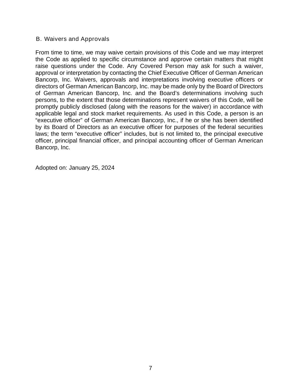 7 B. Waivers and Approvals From time to time, we may waive certain provisions of this Code and we may interpret the Code as applied to specific circumstance and approve certain matters that might raise questions under the Code. Any Covered Person may ask for such a waiver, approval or interpretation by contacting the Chief Executive Officer of German American Bancorp, Inc. Waivers, approvals and interpretations involving executive officers or directors of German American Bancorp, Inc. may be made only by the Board of Directors of German American Bancorp, Inc. and the Board’s determinations involving such persons, to the extent that those determinations represent waivers of this Code, will be promptly publicly disclosed (along with the reasons for the waiver) in accordance with applicable legal and stock market requirements. As used in this Code, a person is an “executive officer” of German American Bancorp, Inc., if he or she has been identified by its Board of Directors as an executive officer for purposes of the federal securities laws; the term “executive officer” includes, but is not limited to, the principal executive officer, principal financial officer, and principal accounting officer of German American Bancorp, Inc. Adopted on: January 25, 2024