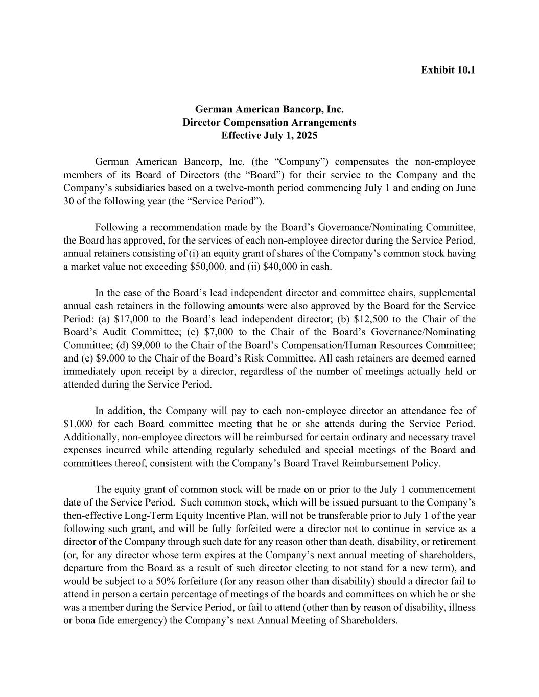 Exhibit 10.1 German American Bancorp, Inc. Director Compensation Arrangements Effective July 1, 2025 German American Bancorp, Inc. (the “Company”) compensates the non-employee members of its Board of Directors (the “Board”) for their service to the Company and the Company’s subsidiaries based on a twelve-month period commencing July 1 and ending on June 30 of the following year (the “Service Period”). Following a recommendation made by the Board’s Governance/Nominating Committee, the Board has approved, for the services of each non-employee director during the Service Period, annual retainers consisting of (i) an equity grant of shares of the Company’s common stock having a market value not exceeding $50,000, and (ii) $40,000 in cash. In the case of the Board’s lead independent director and committee chairs, supplemental annual cash retainers in the following amounts were also approved by the Board for the Service Period: (a) $17,000 to the Board’s lead independent director; (b) $12,500 to the Chair of the Board’s Audit Committee; (c) $7,000 to the Chair of the Board’s Governance/Nominating Committee; (d) $9,000 to the Chair of the Board’s Compensation/Human Resources Committee; and (e) $9,000 to the Chair of the Board’s Risk Committee. All cash retainers are deemed earned immediately upon receipt by a director, regardless of the number of meetings actually held or attended during the Service Period. In addition, the Company will pay to each non-employee director an attendance fee of $1,000 for each Board committee meeting that he or she attends during the Service Period. Additionally, non-employee directors will be reimbursed for certain ordinary and necessary travel expenses incurred while attending regularly scheduled and special meetings of the Board and committees thereof, consistent with the Company’s Board Travel Reimbursement Policy. The equity grant of common stock will be made on or prior to the July 1 commencement date of the Service Period. Such common stock, which will be issued pursuant to the Company’s then-effective Long-Term Equity Incentive Plan, will not be transferable prior to July 1 of the year following such grant, and will be fully forfeited were a director not to continue in service as a director of the Company through such date for any reason other than death, disability, or retirement (or, for any director whose term expires at the Company’s next annual meeting of shareholders, departure from the Board as a result of such director electing to not stand for a new term), and would be subject to a 50% forfeiture (for any reason other than disability) should a director fail to attend in person a certain percentage of meetings of the boards and committees on which he or she was a member during the Service Period, or fail to attend (other than by reason of disability, illness or bona fide emergency) the Company’s next Annual Meeting of Shareholders.