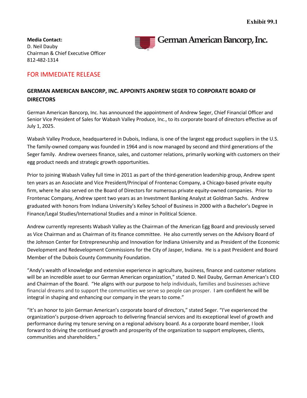 Exhibit 99.1 Media Contact: D. Neil Dauby Chairman & Chief Executive Officer 812-482-1314 FOR IMMEDIATE RELEASE GERMAN AMERICAN BANCORP, INC. APPOINTS ANDREW SEGER TO CORPORATE BOARD OF DIRECTORS German American Bancorp, Inc. has announced the appointment of Andrew Seger, Chief Financial Officer and Senior Vice President of Sales for Wabash Valley Produce, Inc., to its corporate board of directors effective as of July 1, 2025. Wabash Valley Produce, headquartered in Dubois, Indiana, is one of the largest egg product suppliers in the U.S. The family-owned company was founded in 1964 and is now managed by second and third generations of the Seger family. Andrew oversees finance, sales, and customer relations, primarily working with customers on their egg product needs and strategic growth opportunities. Prior to joining Wabash Valley full time in 2011 as part of the third-generation leadership group, Andrew spent ten years as an Associate and Vice President/Principal of Frontenac Company, a Chicago-based private equity firm, where he also served on the Board of Directors for numerous private equity-owned companies. Prior to Frontenac Company, Andrew spent two years as an Investment Banking Analyst at Goldman Sachs. Andrew graduated with honors from Indiana University’s Kelley School of Business in 2000 with a Bachelor’s Degree in Finance/Legal Studies/International Studies and a minor in Political Science. Andrew currently represents Wabash Valley as the Chairman of the American Egg Board and previously served as Vice Chairman and as Chairman of its finance committee. He also currently serves on the Advisory Board of the Johnson Center for Entrepreneurship and Innovation for Indiana University and as President of the Economic Development and Redevelopment Commissions for the City of Jasper, Indiana. He is a past President and Board Member of the Dubois County Community Foundation. “Andy’s wealth of knowledge and extensive experience in agriculture, business, finance and customer relations will be an incredible asset to our German American organization,” stated D. Neil Dauby, German American’s CEO and Chairman of the Board. “He aligns with our purpose to help individuals, families and businesses achieve financial dreams and to support the communities we serve so people can prosper. I am confident he will be integral in shaping and enhancing our company in the years to come.” “It’s an honor to join German American’s corporate board of directors,” stated Seger. “I’ve experienced the organization’s purpose-driven approach to delivering financial services and its exceptional level of growth and performance during my tenure serving on a regional advisory board. As a corporate board member, I look forward to driving the continued growth and prosperity of the organization to support employees, clients, communities and shareholders.”