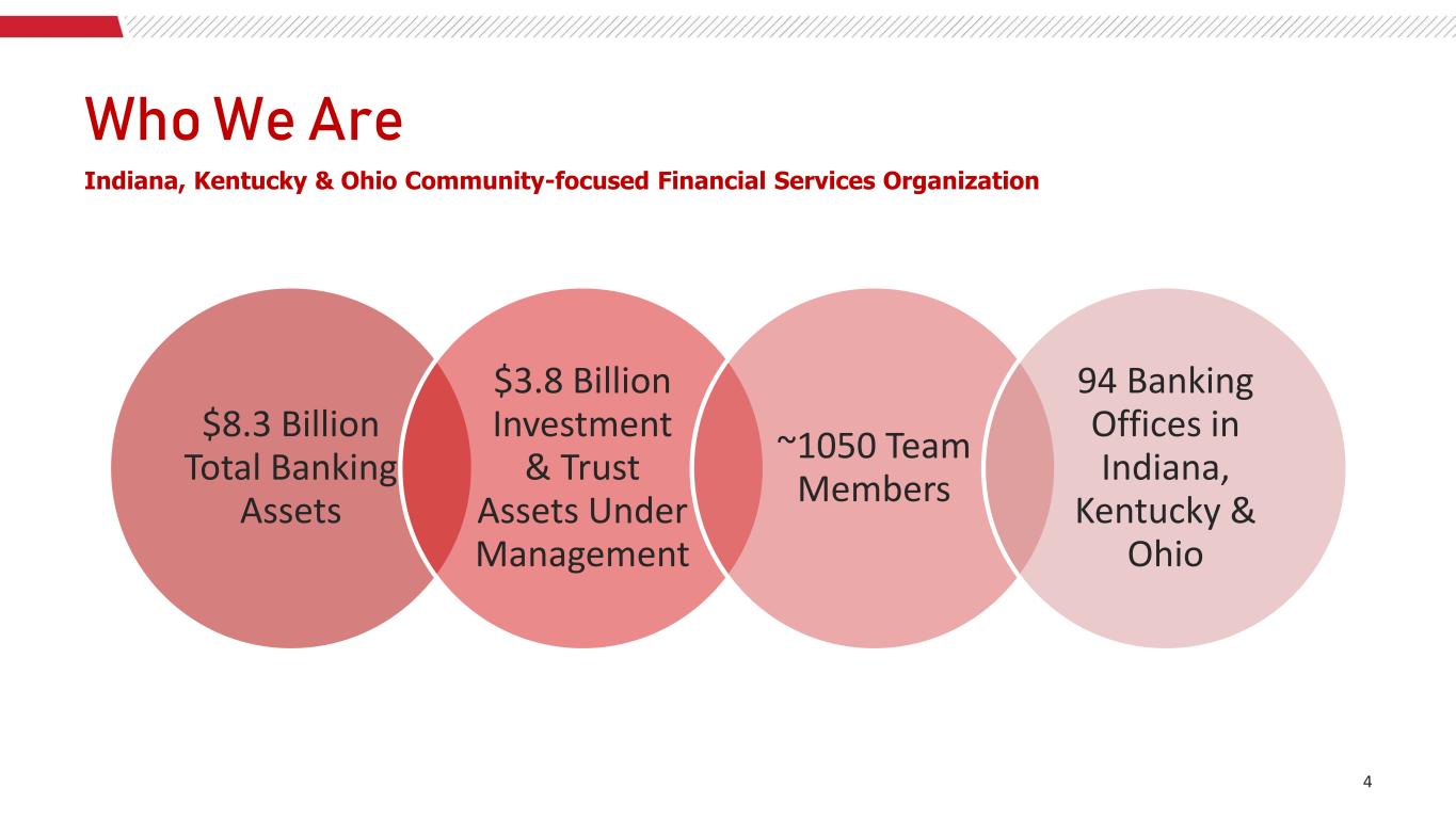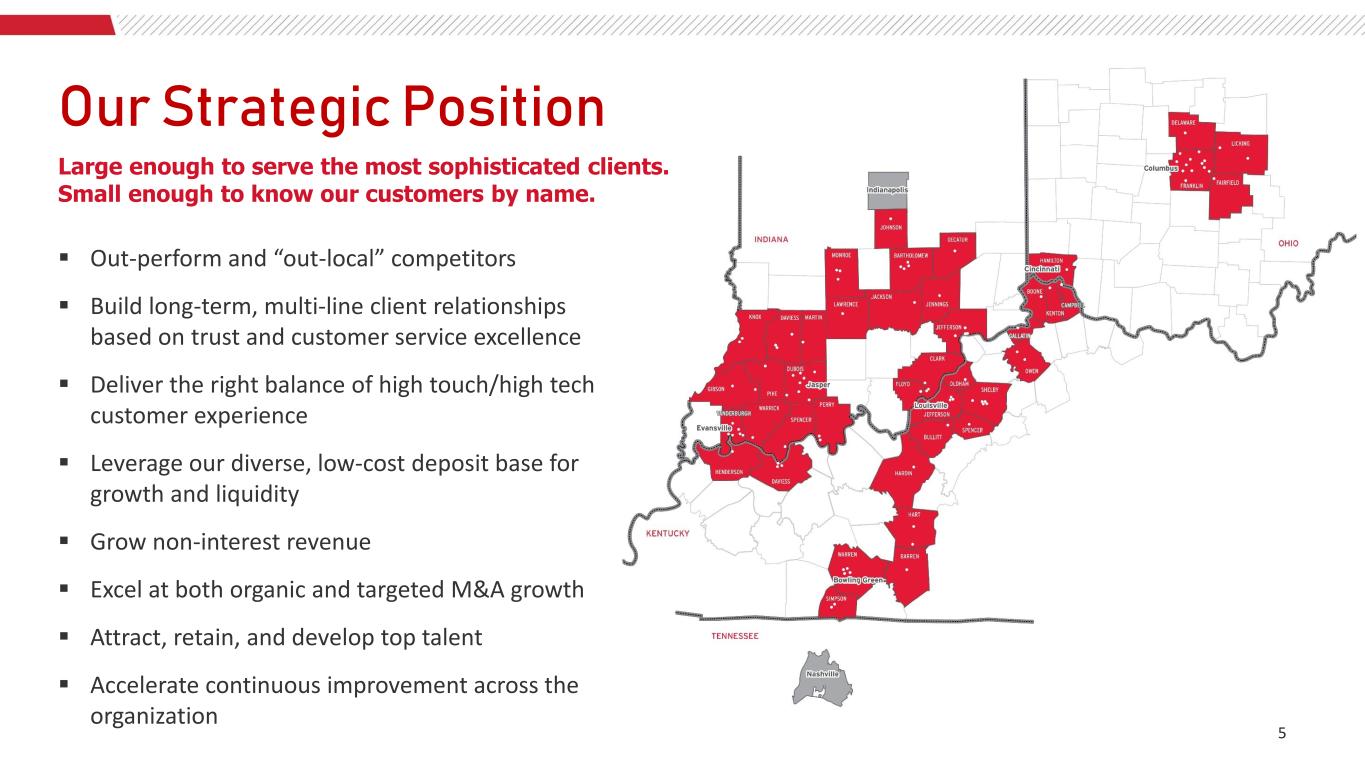 Indiana, Kentucky & Ohio Community-focused Financial Services Organization Who We Are 4 $8.3 Billion Total Banking Assets $3.8 Billion Investment & Trust Assets Under Management ~1050 Team Members 94 Banking Offices in Indiana, Kentucky & Ohio