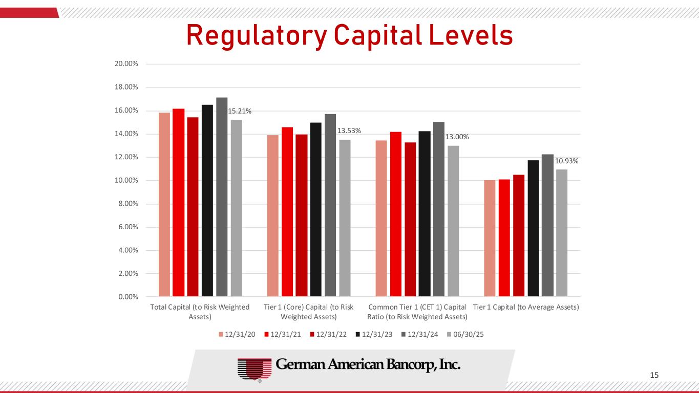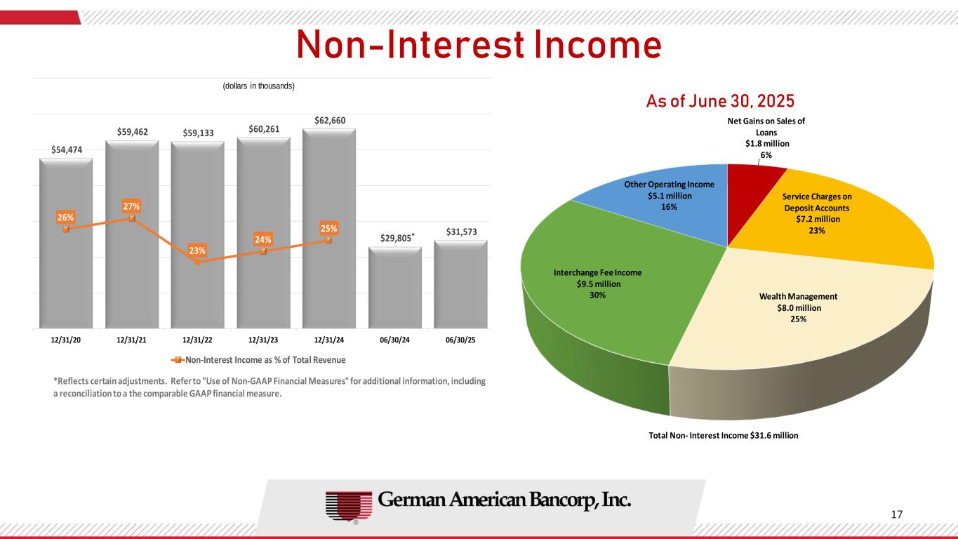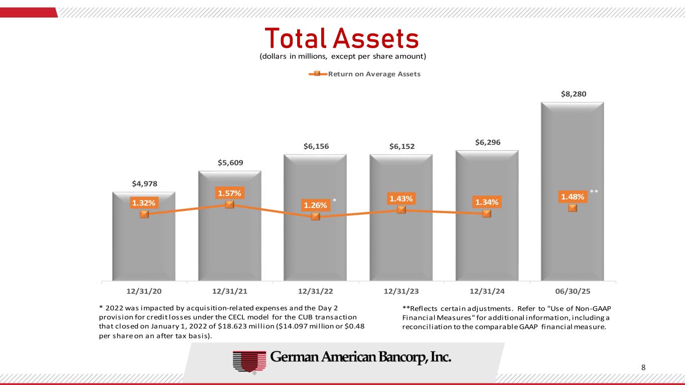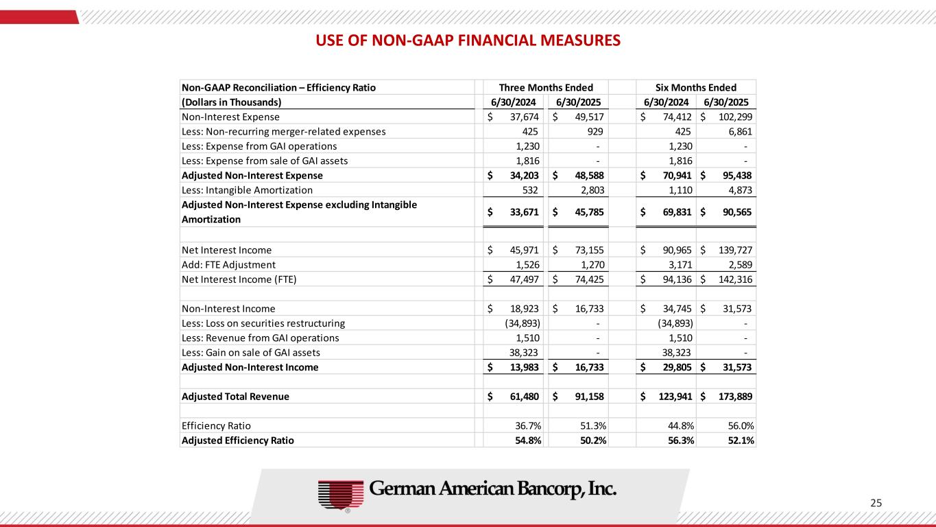 USE OF NON-GAAP FINANCIAL MEASURES 24 Non-GAAP Reconciliation – Return on Average Assets (Dollars in Thousands) 6/30/2024 6/30/2025 6/30/2024 6/30/2025 Net Income, as reported $ 20,530 $ 31,361 $ 39,552 $ 41,878 Adjustments: Plus: CECL Day 2 non-PCD provision - - - 12,150 Plus: Non-recurring merger-related expenses 318 697 318 5,317 Less: Loss on securities restructuring (27,189) - (27,189) - Less: Income from GAI operations 210 - 210 - Less: Gain on sale of GAI assets 27,476 - 27,476 - Adjusted Net Income $ 20,351 $ 32,058 $ 39,373 $ 59,345 Average Assets $ 6,230,676 $ 8,424,328 $ 6,166,523 $ 8,028,766 Return on Average Assets, as reported 1.49% 1.49% 1.04% 1.04% Return on Average Assets, as adjusted 1.31% 1.52% 1.28% 1.48% Non-GAAP Reconciliation – Return on Tangible Equity (Dollars in Thousands) 6/30/2024 6/30/2025 6/30/2024 6/30/2025 Adjusted Net Income $ 20,351 $ 32,058 $ 39,373 $ 59,345 Average Equity, as reported $ 649,886 $ 1,048,227 $ 653,334 $ 990,129 Average Intangibles, as reported 185,272 417,016 185,800 378,011 Average Tangible Equity $ 464,614 $ 631,211 $ 467,534 $ 612,118 Return on Tangible Equity, as reported 17.67% 19.87% 16.92% 13.68% Return on Tangible Equity, as adjusted 17.52% 20.32% 16.84% 19.39% Three Months Ended Six Months Ended Six Months EndedThree Months Ended