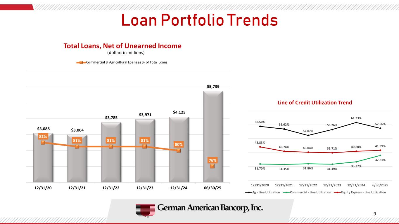 Total Assets 8 $4,978 $5,609 $6,156 $6,152 $6,296 $8,280 1.32% 1.57% 1.26% 1.43% 1.34% 1.48% 12/31/20 12/31/21 12/31/22 12/31/23 12/31/24 06/30/25 (dollars in millions, except per share amount) Return on Average Assets * ** **Reflects certain adjustments. Refer to "Use of Non-GAAP Financial Measures" for additional information, including a reconciliation to the comparable GAAP financial measure. ** * 2022 was impacted by acquisition-related expenses and the Day 2 provision for credit losses under the CECL model for the CUB transaction that closed on January 1, 2022 of $18.623 mill ion ($14.097 million or $0.48 per share on an after tax basis).