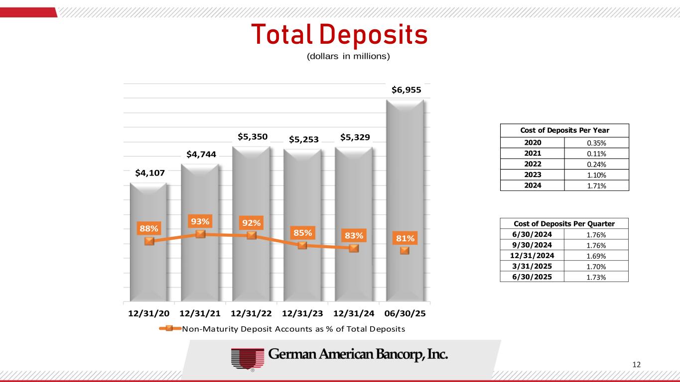 Non-Performing Assets to Total Assets 11 0.44% 0.26% 0.23% 0.15% 0.18% 0.30% 0.52% 0.34% 0.29% 0.37% 0.49% 0.49% 12/31/20 12/31/21 12/31/22 12/31/23 12/31/24 06/30/25 GABC Peer Group * * Peer Group (St. Louis Federal Reserve District BHC with Total Assets between $3 and $10 billion) Data. ** As of 3/31/2025 * *