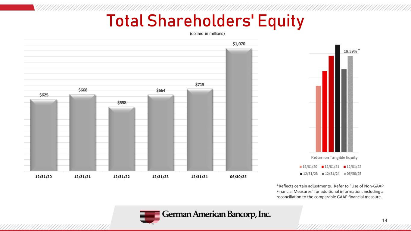 Commercial $2,382 million 34% Public Fund $1,321 million 19% Retail $3,252 million 47% 13 Total Deposit Composition as of 06/30/2025 Total Deposits $6,955 million24% of Total Deposits are Uninsured and Uncollateralized as of 6/30/2025. Average Deposit Account Size equals $27,665. Non-Interest Bearing Demand $1,897 million 27% Interest Bearing Demand, Savings & Money Market $3,728 million 54% Time Deposits > $100,000 $808 million 12% Time Deposits < $100,000 $522 million 7%