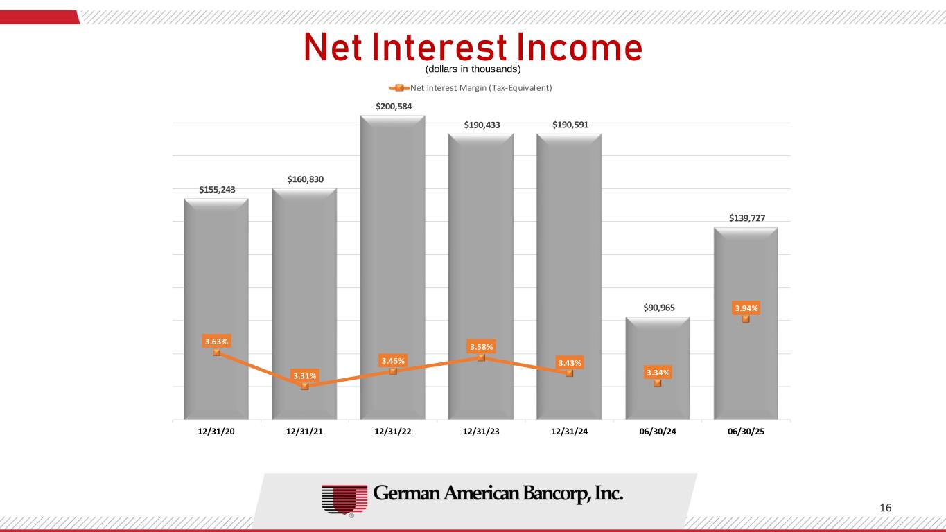 Regulatory Capital Levels 15 15.21% 13.53% 13.00% 10.93% 0.00% 2.00% 4.00% 6.00% 8.00% 10.00% 12.00% 14.00% 16.00% 18.00% 20.00% Total Capital (to Risk Weighted Assets) Tier 1 (Core) Capital (to Risk Weighted Assets) Common Tier 1 (CET 1) Capital Ratio (to Risk Weighted Assets) Tier 1 Capital (to Average Assets) 12/31/20 12/31/21 12/31/22 12/31/23 12/31/24 06/30/25
