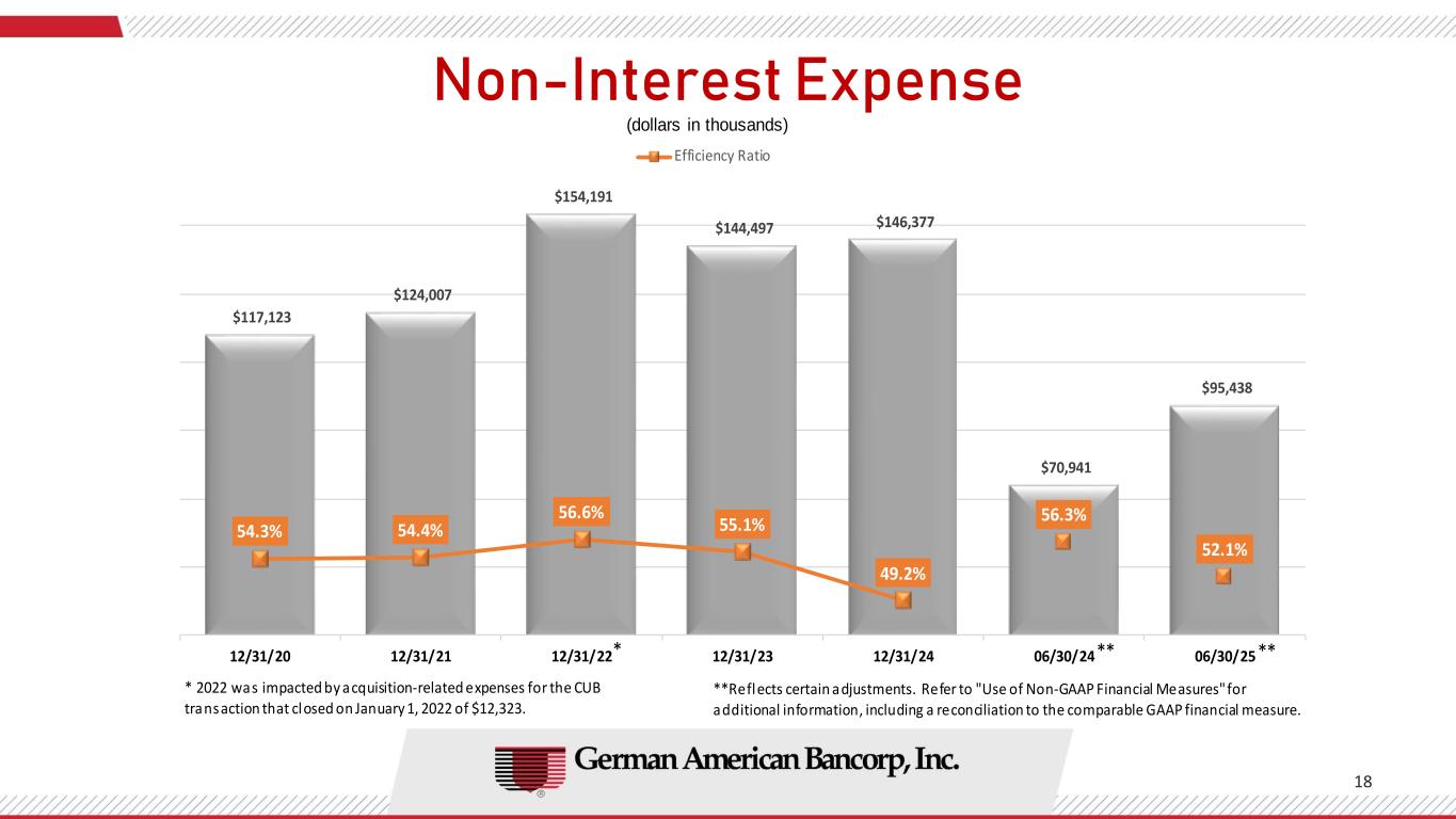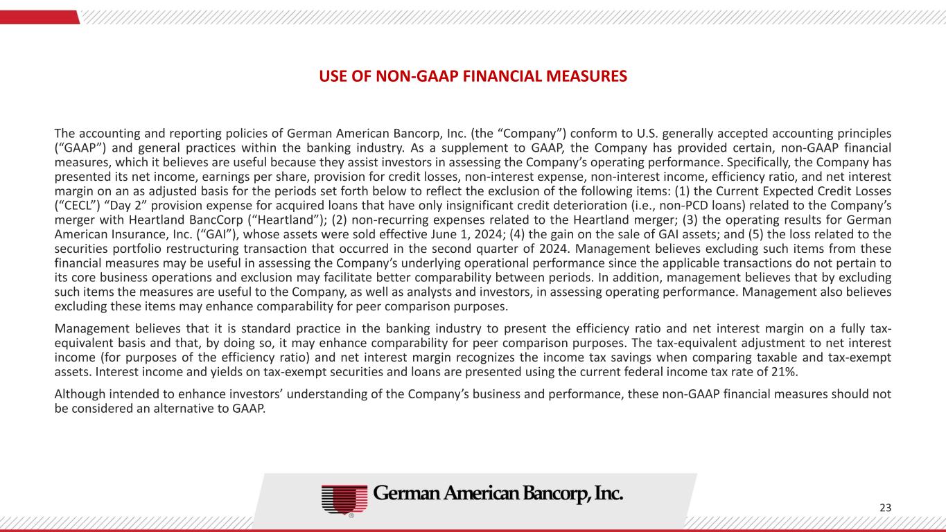 USE OF NON-GAAP FINANCIAL MEASURES The accounting and reporting policies of German American Bancorp, Inc. (the “Company”) conform to U.S. generally accepted accounting principles (“GAAP”) and general practices within the banking industry. As a supplement to GAAP, the Company has provided certain, non-GAAP financial measures, which it believes are useful because they assist investors in assessing the Company’s operating performance. Specifically, the Company has presented its net income, earnings per share, provision for credit losses, non-interest expense, non-interest income, efficiency ratio, and net interest margin on an as adjusted basis for the periods set forth below to reflect the exclusion of the following items: (1) the Current Expected Credit Losses (“CECL”) “Day 2” provision expense for acquired loans that have only insignificant credit deterioration (i.e., non-PCD loans) related to the Company’s merger with Heartland BancCorp (“Heartland”); (2) non-recurring expenses related to the Heartland merger; (3) the operating results for German American Insurance, Inc. (“GAI”), whose assets were sold effective June 1, 2024; (4) the gain on the sale of GAI assets; and (5) the loss related to the securities portfolio restructuring transaction that occurred in the second quarter of 2024. Management believes excluding such items from these financial measures may be useful in assessing the Company’s underlying operational performance since the applicable transactions do not pertain to its core business operations and exclusion may facilitate better comparability between periods. In addition, management believes that by excluding such items the measures are useful to the Company, as well as analysts and investors, in assessing operating performance. Management also believes excluding these items may enhance comparability for peer comparison purposes. Management believes that it is standard practice in the banking industry to present the efficiency ratio and net interest margin on a fully tax- equivalent basis and that, by doing so, it may enhance comparability for peer comparison purposes. The tax-equivalent adjustment to net interest income (for purposes of the efficiency ratio) and net interest margin recognizes the income tax savings when comparing taxable and tax-exempt assets. Interest income and yields on tax-exempt securities and loans are presented using the current federal income tax rate of 21%. Although intended to enhance investors’ understanding of the Company’s business and performance, these non-GAAP financial measures should not be considered an alternative to GAAP. 23