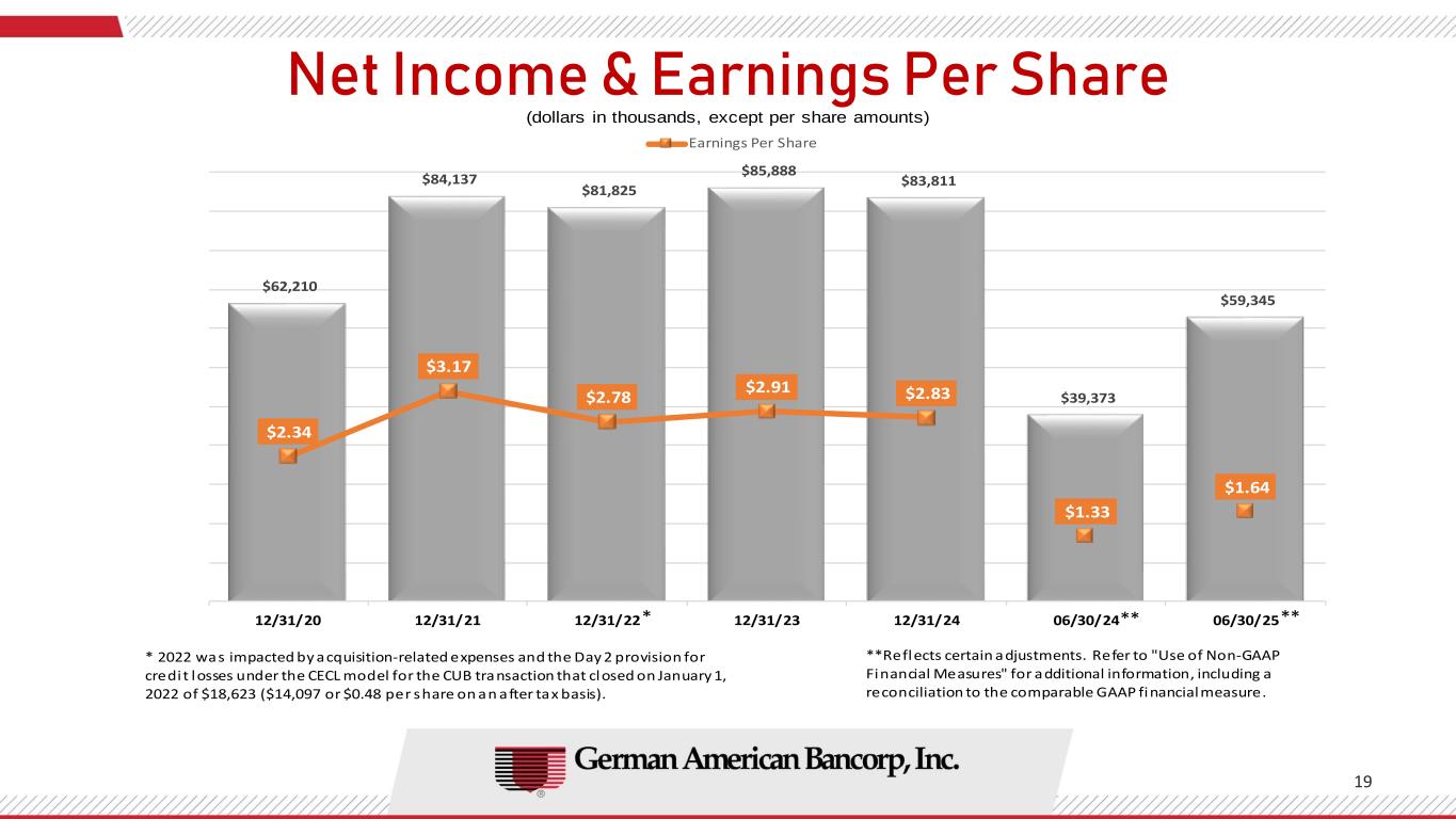 Non-Interest Expense 18 $117,123 $124,007 $154,191 $144,497 $146,377 $70,941 $95,438 54.3% 54.4% 56.6% 55.1% 49.2% 56.3% 52.1% 12/31/20 12/31/21 12/31/22 12/31/23 12/31/24 06/30/24 06/30/25 Efficiency Ratio * 2022 was impacted by acquisition-related expenses for the CUB transaction that closed on January 1, 2022 of $12,323. * (dollars in thousands) **Reflects certain adjustments. Refer to "Use of Non-GAAP Financial Measures" for additional information, including a reconciliation to the comparable GAAP financial measure. ****