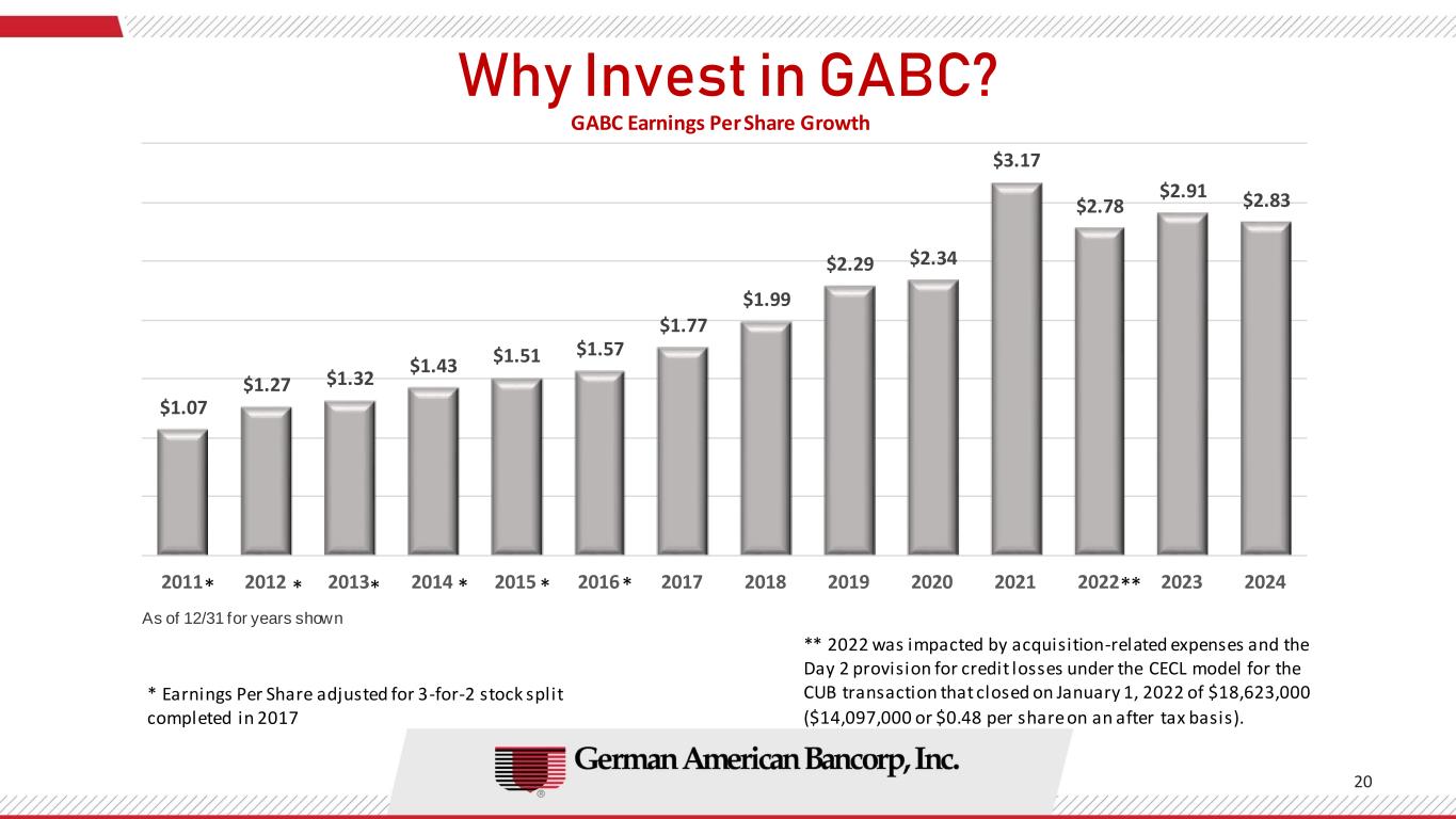 Why Invest in GABC? 20 $1.07 $1.27 $1.32 $1.43 $1.51 $1.57 $1.77 $1.99 $2.29 $2.34 $3.17 $2.78 $2.91 $2.83 2011 2012 2013 2014 2015 2016 2017 2018 2019 2020 2021 2022 2023 2024 As of 12/31 for years shown * Earnings Per Share adjusted for 3-for-2 stock split completed in 2017 ***** *** GABC Earnings Per Share Growth ** 2022 was impacted by acquisition-related expenses and the Day 2 provision for credit losses under the CECL model for the CUB transaction that closed on January 1, 2022 of $18,623,000 ($14,097,000 or $0.48 per share on an after tax basis).