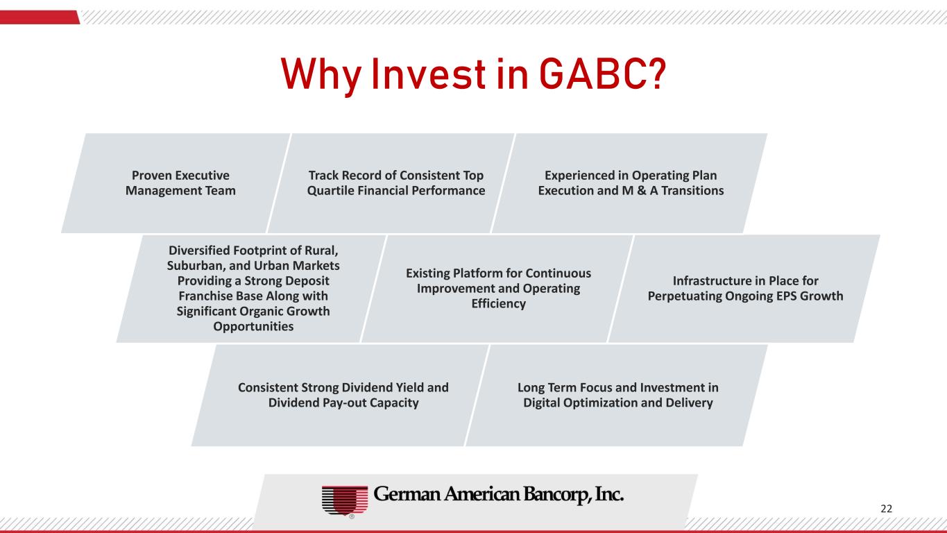 Why Invest in GABC? 21 $0.40 $0.43 $0.45 $0.48 $0.52 $0.60 $0.68 $0.76 $0.84 $0.92 $1.00 $1.08 2013 2014 2015 2016 2017 2018 2019 2020 2021 2022 2023 2024 *Dividends per share adjusted for 3-for-2 stock split completed in 2017 As of 12/31 for years shown * * * * Cash Dividend Growth