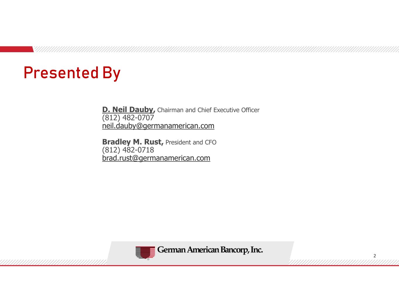 Presented By D. Neil Dauby, Chairman and Chief Executive Officer (812) 482-0707 neil.dauby@germanamerican.com Bradley M. Rust, President and CFO (812) 482-0718 brad.rust@germanamerican.com 2