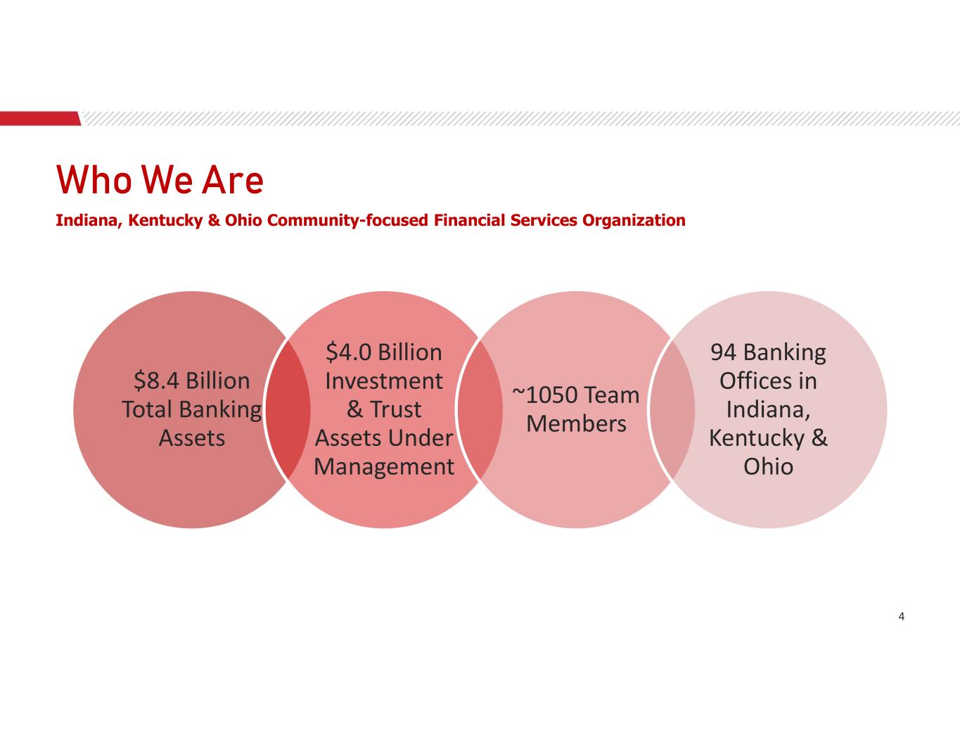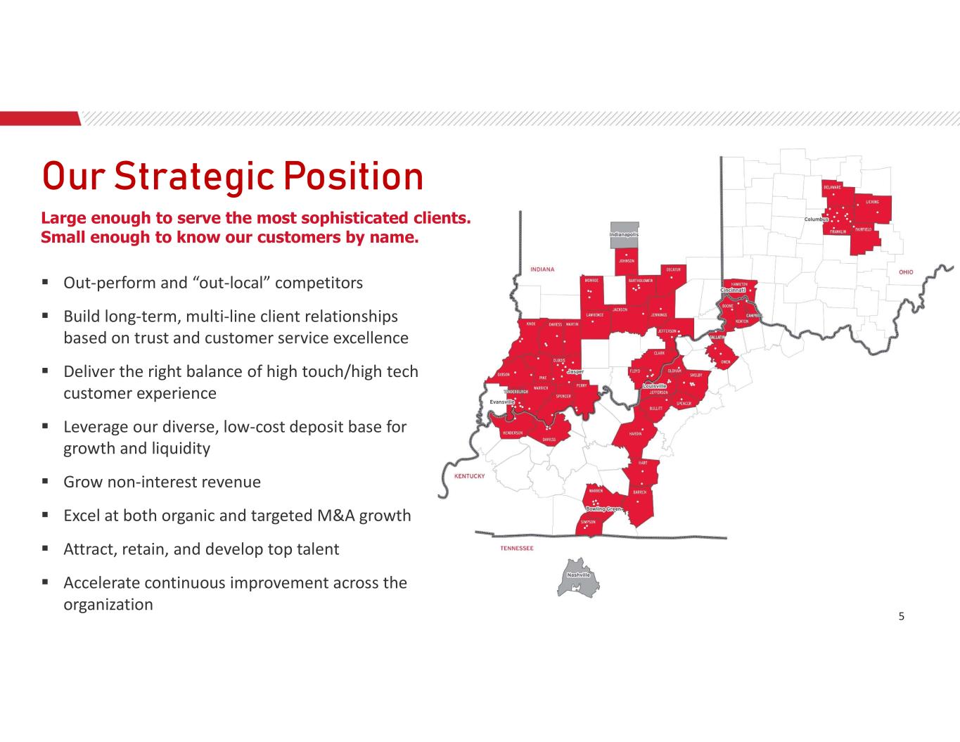 Indiana, Kentucky & Ohio Community-focused Financial Services Organization Who We Are 4 $8.4 Billion Total Banking Assets $4.0 Billion Investment & Trust Assets Under Management ~1050 Team Members 94 Banking Offices in Indiana, Kentucky & Ohio