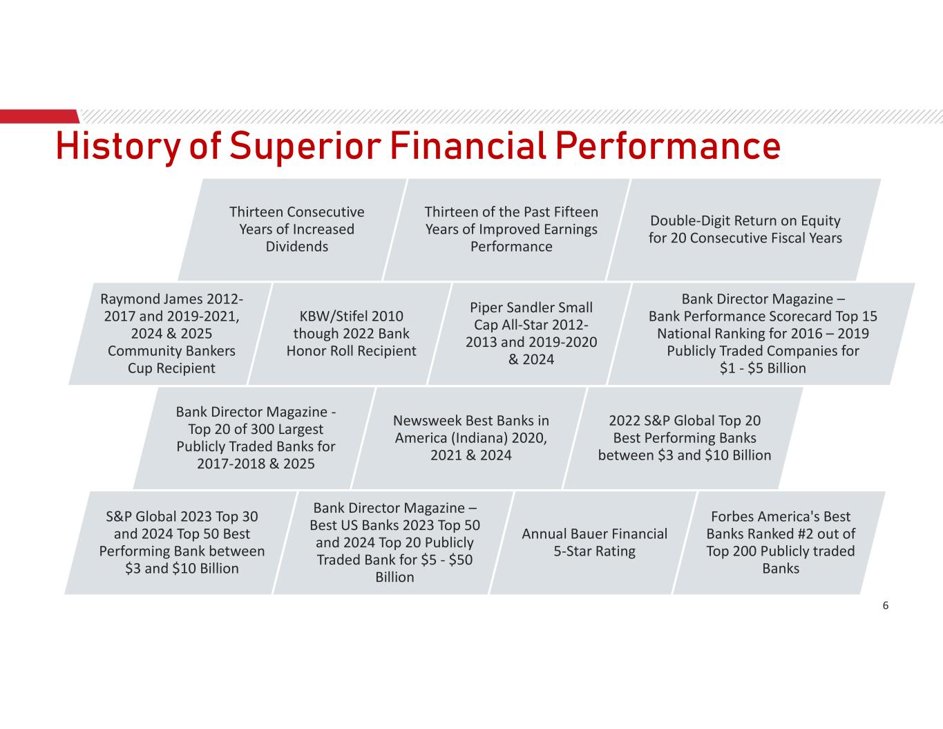 History of Superior Financial Performance 6 Bank Director Magazine - Top 20 of 300 Largest Publicly Traded Banks for 2017-2018 & 2025 Newsweek Best Banks in America (Indiana) 2020, 2021 & 2024 2022 S&P Global Top 20 Best Performing Banks between $3 and $10 Billion S&P Global 2023 Top 30 and 2024 Top 50 Best Performing Bank between $3 and $10 Billion Bank Director Magazine – Best US Banks 2023 Top 50 and 2024 Top 20 Publicly Traded Bank for $5 - $50 Billion Annual Bauer Financial 5-Star Rating Forbes America's Best Banks Ranked #2 out of Top 200 Publicly traded Banks Thirteen Consecutive Years of Increased Dividends Thirteen of the Past Fifteen Years of Improved Earnings Performance Double-Digit Return on Equity for 20 Consecutive Fiscal Years Raymond James 2012- 2017 and 2019-2021, 2024 & 2025 Community Bankers Cup Recipient KBW/Stifel 2010 though 2022 Bank Honor Roll Recipient Piper Sandler Small Cap All-Star 2012- 2013 and 2019-2020 & 2024 Bank Director Magazine – Bank Performance Scorecard Top 15 National Ranking for 2016 – 2019 Publicly Traded Companies for $1 - $5 Billion